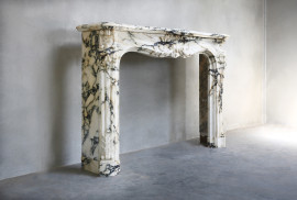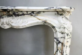 Sehr exklusiver antiker Marmorkamin aus dem Jahr 1820! Der Marmortyp dieses schönen Kamins ist Paonazzo-Marmor aus der Toskana. Die Merkmale von Paonazzo-Marmor sind die Vielfalt der Farben und der Zusammensetzung. Die hohe Dosis Eisenoxid erzeugt einen warmen orange / gelben Farbe, der durch die Venen fließt. Dieser beeindruckende Mantel ist im Stil von Louis XV aus der Rococco Regence-Zeit! Wir haben diesen Kamin vom Hotel de Paris aus Paris zerlegt. Die Jakobsmuschel in der Mitte des Vorderteils mit durchgehenden Verzierungen an den Beinen bildet ein anmutiges Ganzes. Ein sehr schöner Kamin, der für jedes Interieur wertvoll ist!