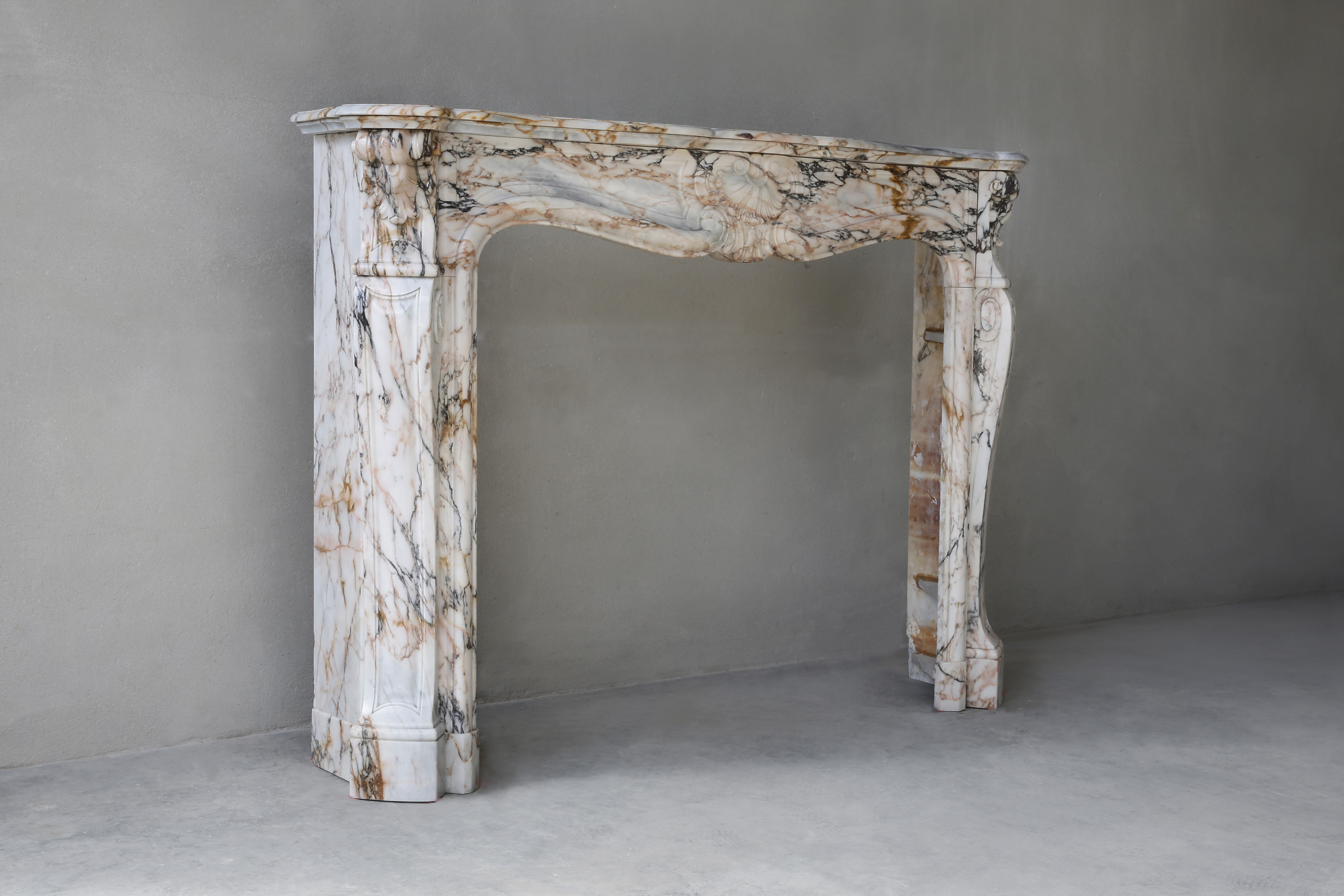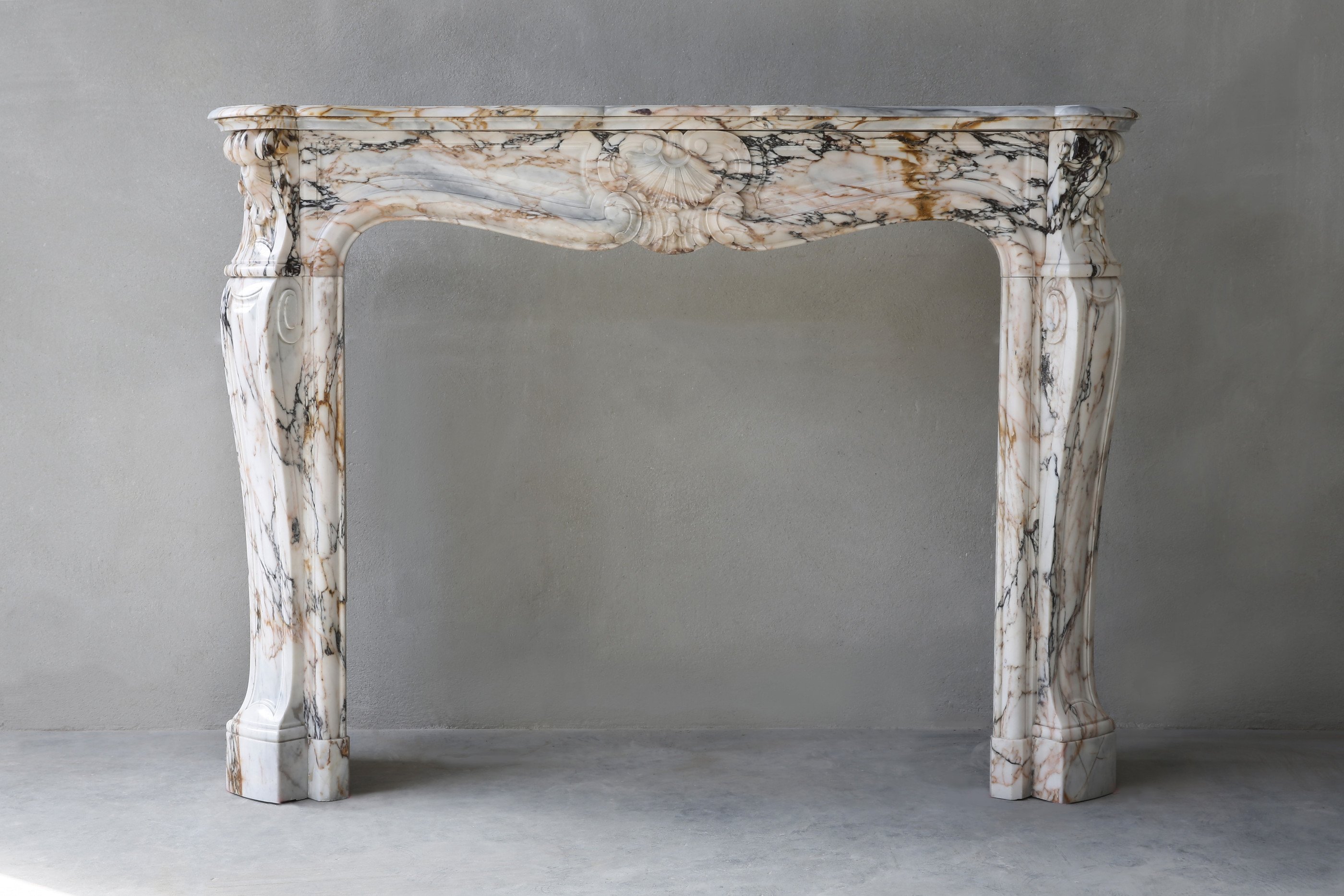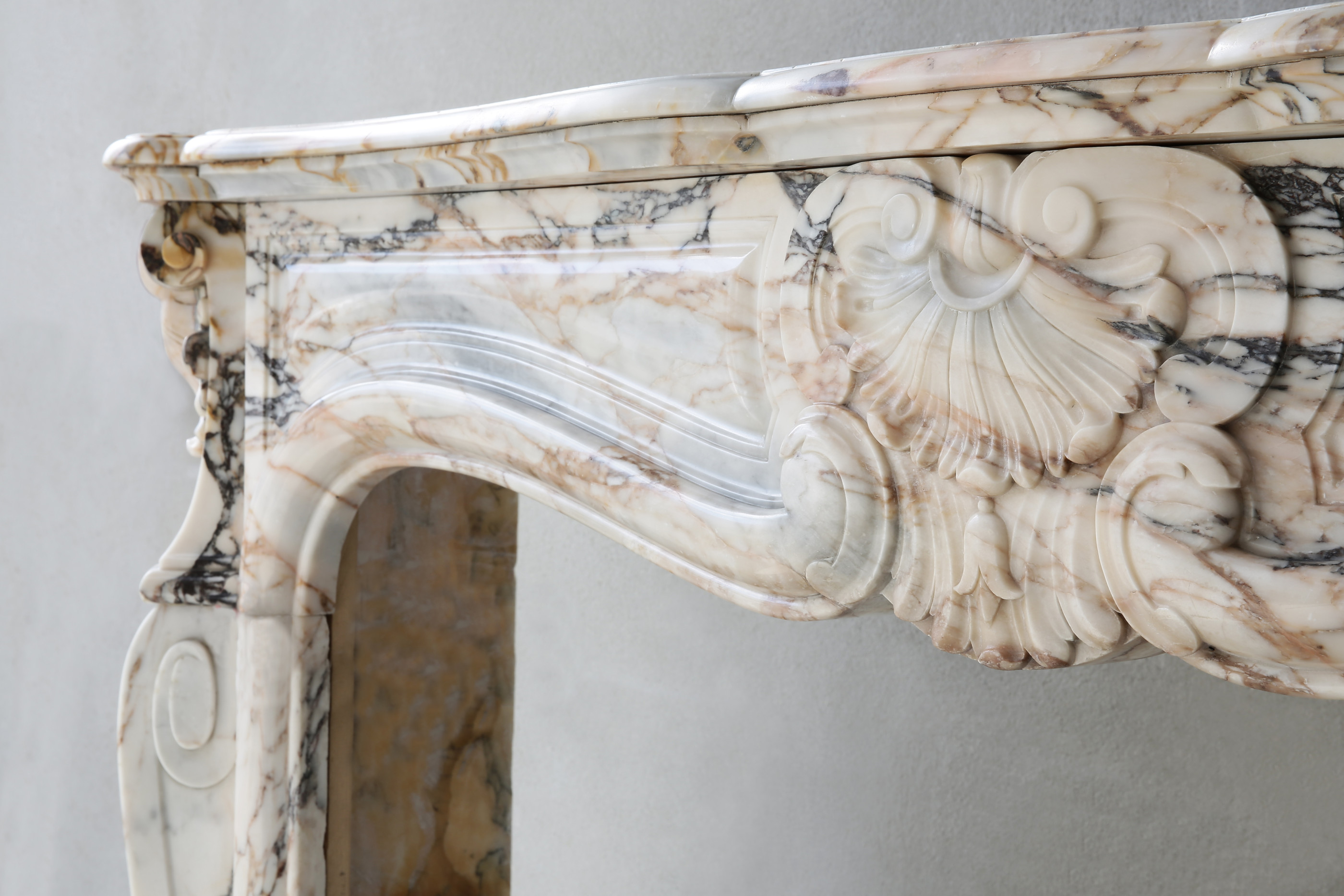 Schicker antiker Marmormantel von 1890 - 1900. Dieser schöne Kamin ist aus dem griechischen Marmortyp Skyros gemeißelt und hat ein warmes Farbschema. Dieser Kamin ist im Louis XV-Stil und hat eine Jakobsmuschel in der Mitte des vorderen Teils mit durchgehenden Verzierungen an den Beinen. Ein wunderschöner, stilvoller Kamin aus der Brüsseler Altstadt.
