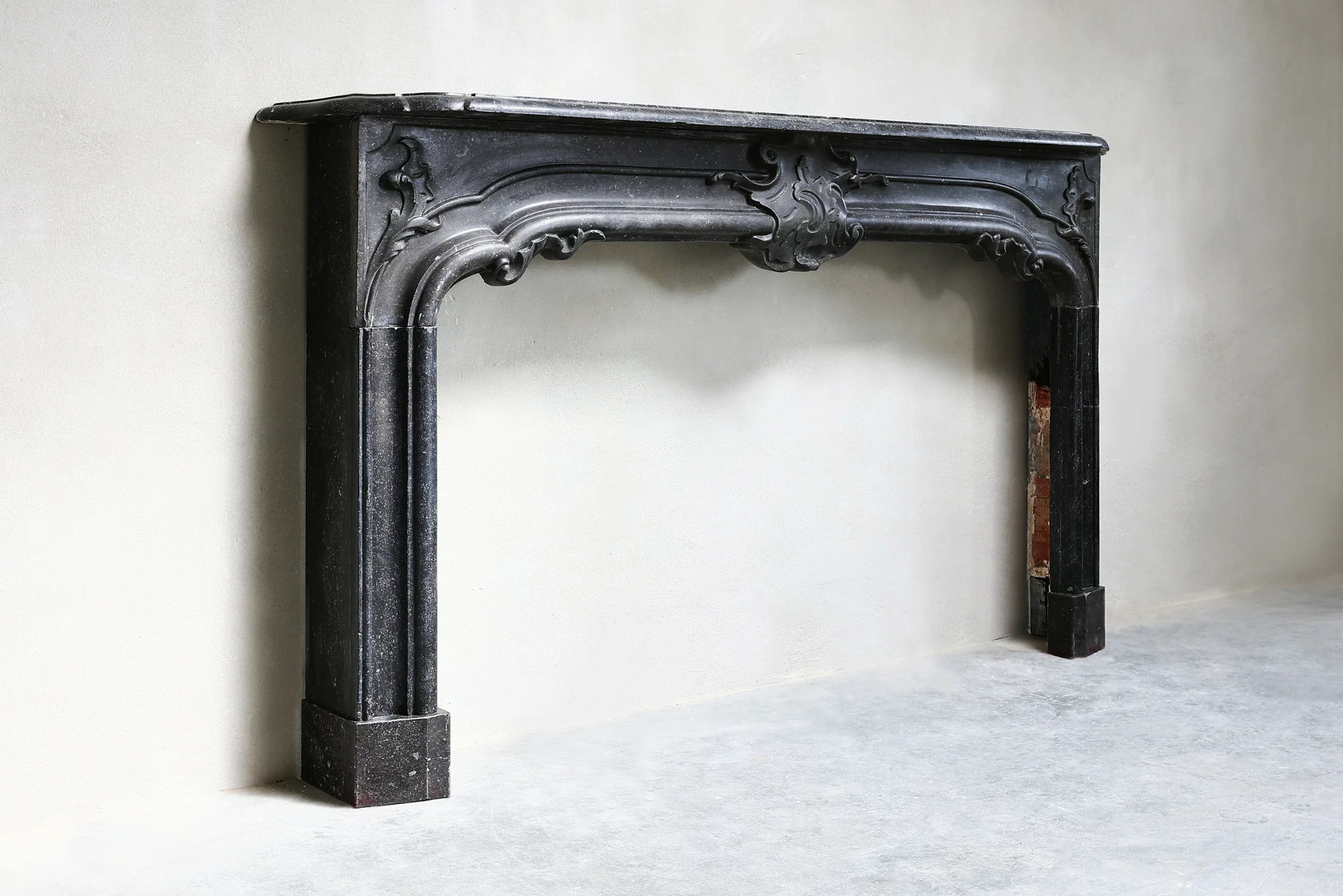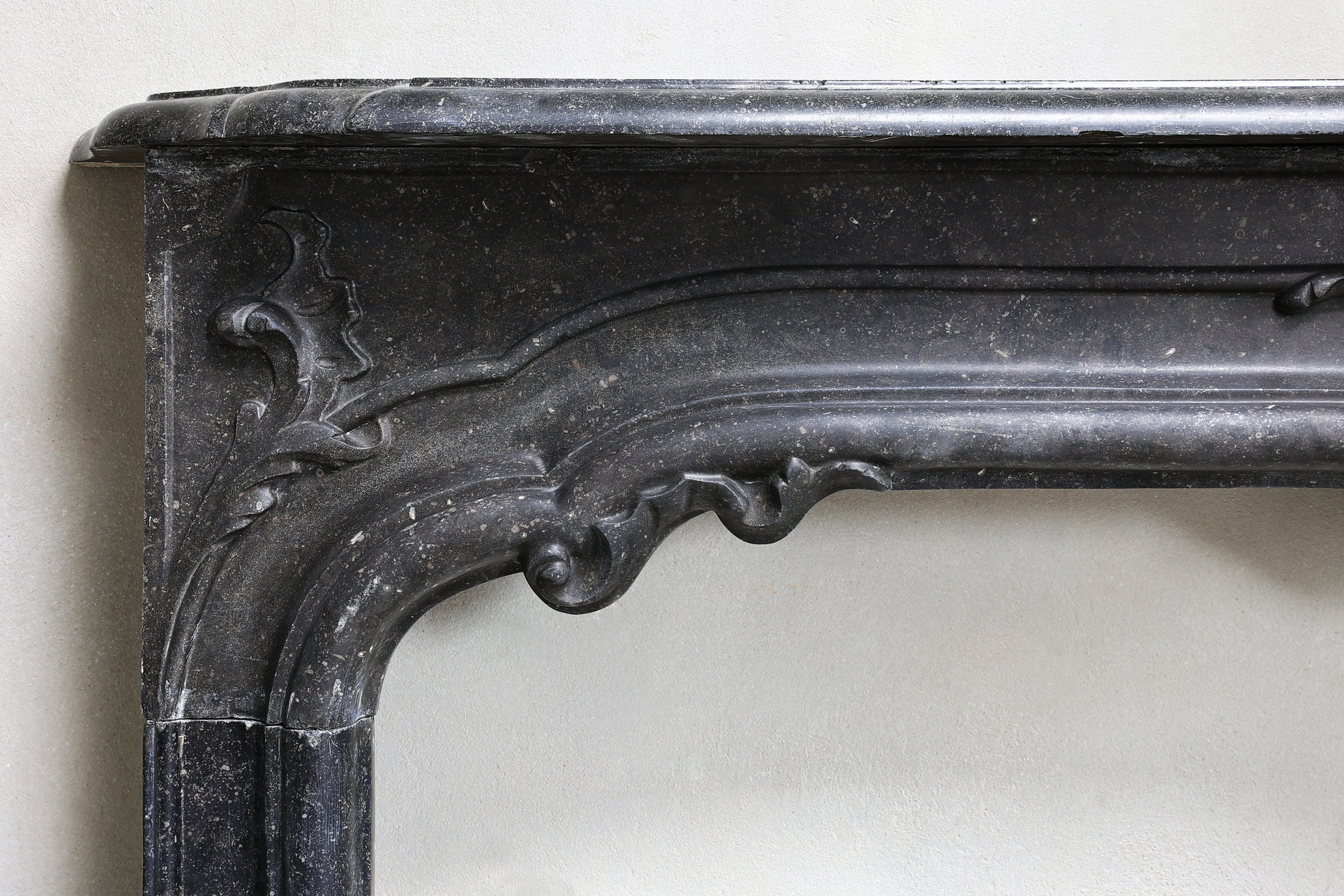 Wunderschön dekorierter Kamin aus belgischem Blaustein aus dem 19. Jahrhundert mit einer Breite von nicht weniger als 208 cm. Dieser Kamin ist im Stil von Ludwig XVI. Ein schöner markanter Kamin mit Ornamenten in der Mitte des Vorderteils und an den Beinen.