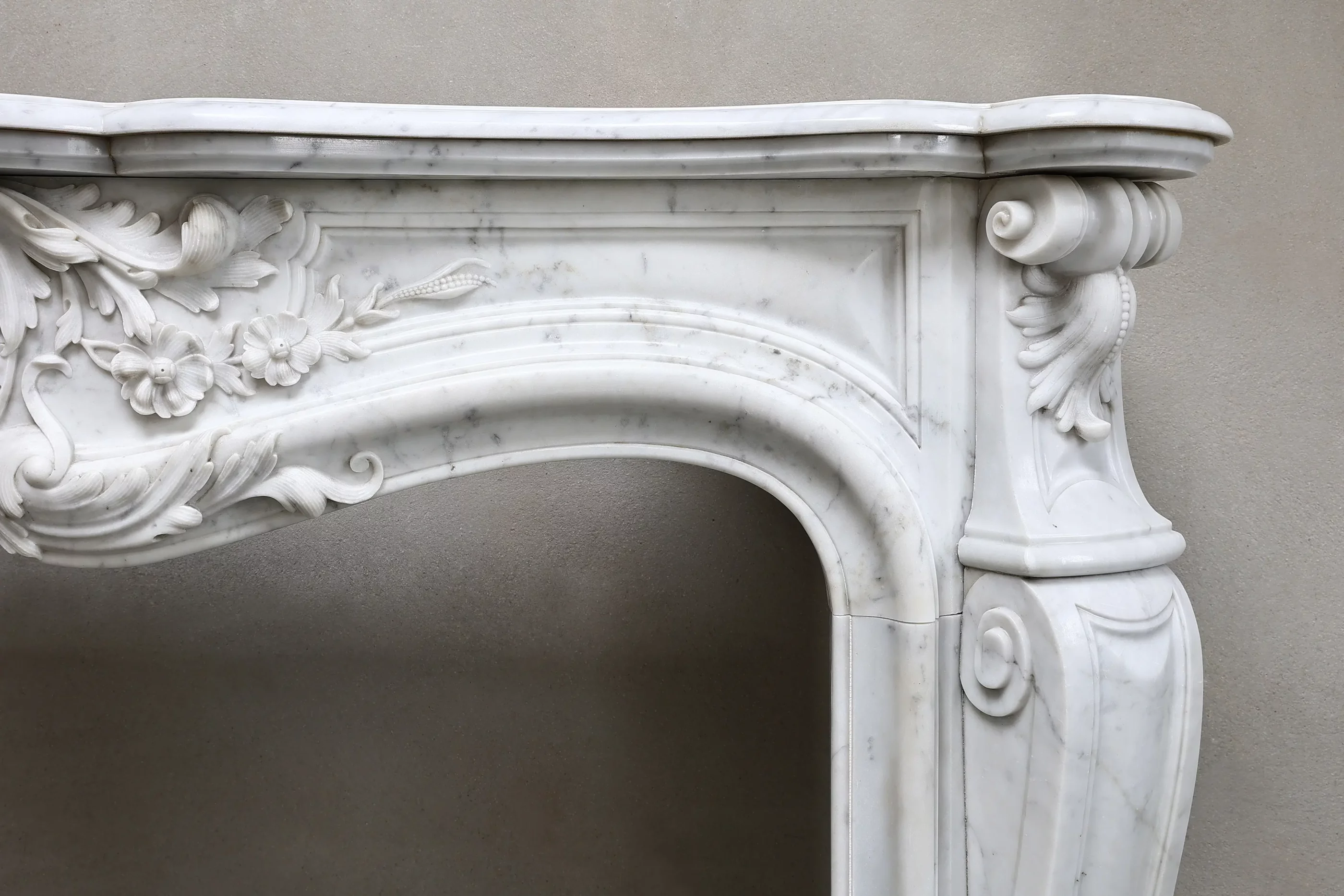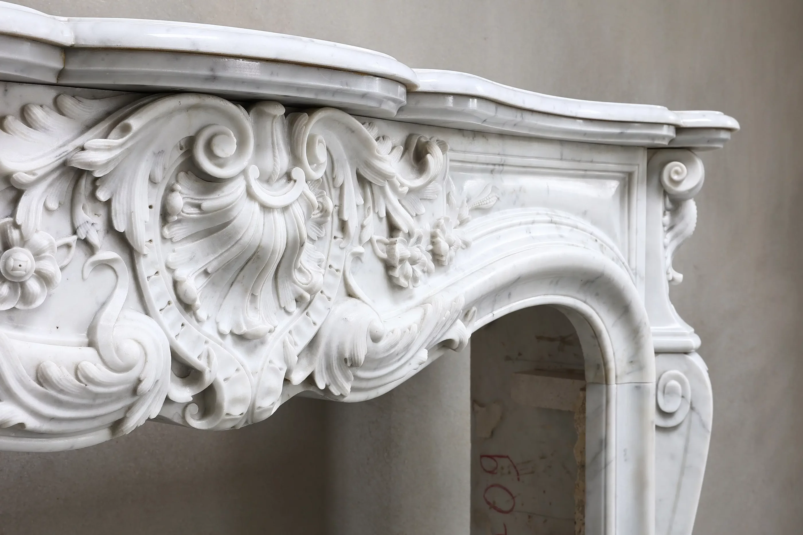 Wunderschöner, exklusiver antiker Kamin aus Carrara-Marmor aus Italien! Dieser Kamin aus dem 19. Jahrhundert ist im Stil Ludwigs XV. gefertigt und reich mit verschiedenen Ornamenten an Vorderseite und Beinen verziert. Ein stilvoller Kamin aus unserer Kollektion.