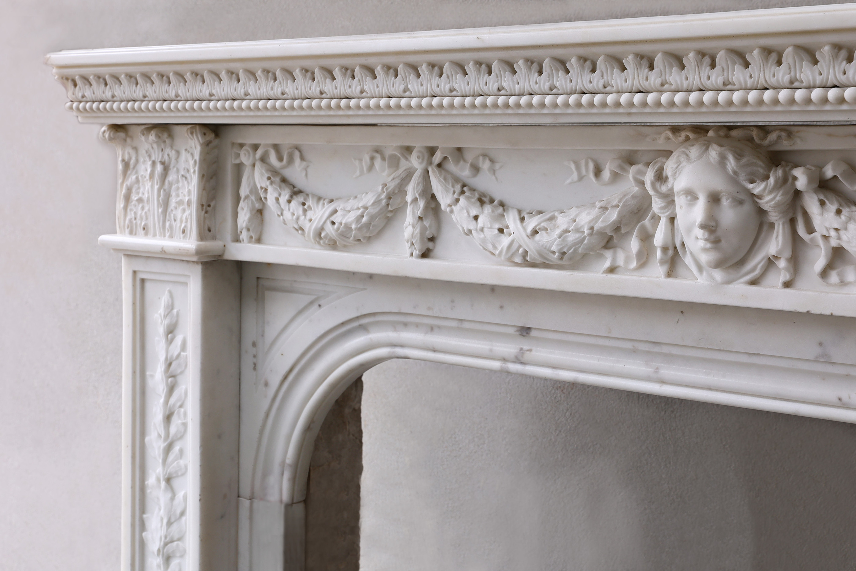 Dieser antike Marmorkamin aus feinstem Carrara-Marmor ist ein herausragendes Beispiel französischer Handwerkskunst des 19. Jahrhunderts. Die Kaminumrahmung ist reich verziert mit Girlanden, Akanthusblättern und einem zentralen Maskaron. Durch die helle Farbigkeit und die zarte Maserung des Carrara-Marmors wirkt der Kamin zugleich elegant und monumental – ein Blickfang für klassische Interieurs oder moderne Räume mit historischem Akzent.