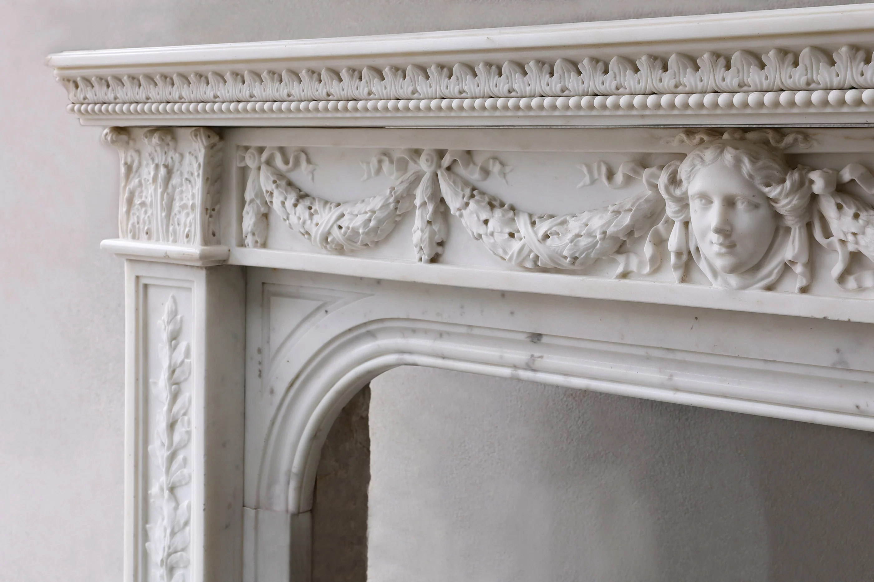 Das Fries ist mit floralen Girlanden geschmückt, die Fülle und Festlichkeit symbolisieren. Das zentrale Maskaron verweist auf die französische Tradition allegorischer Darstellung, wie man sie in Pariser Stadtpalais oder Landschlössern findet. Die Pilaster sind mit vertikalen Blattornamenten versehen und verleihen dem Kamin zusätzliche Eleganz. Ein kräftiges Gesims mit Eierstab-Motiv rundet die Komposition ab.