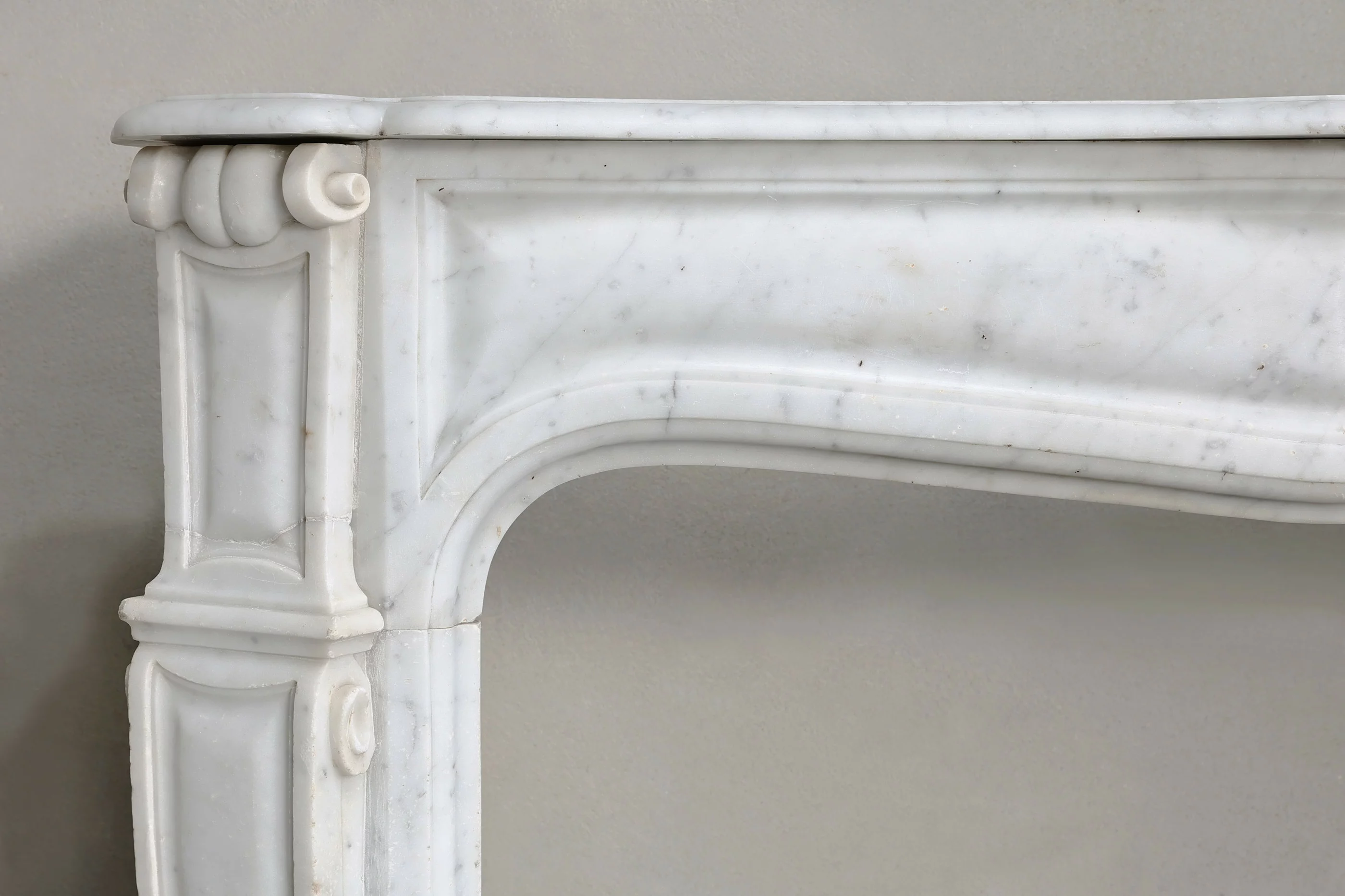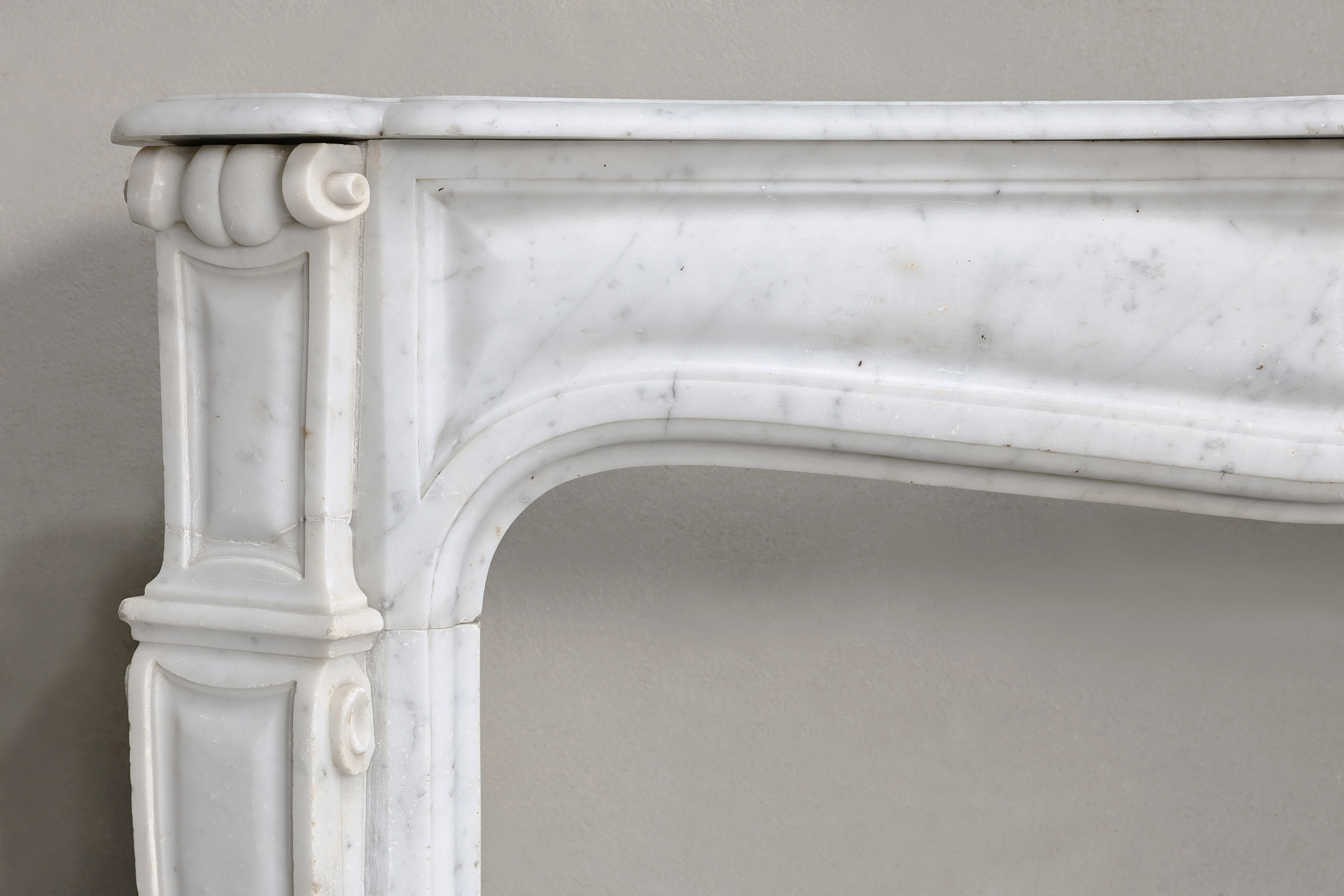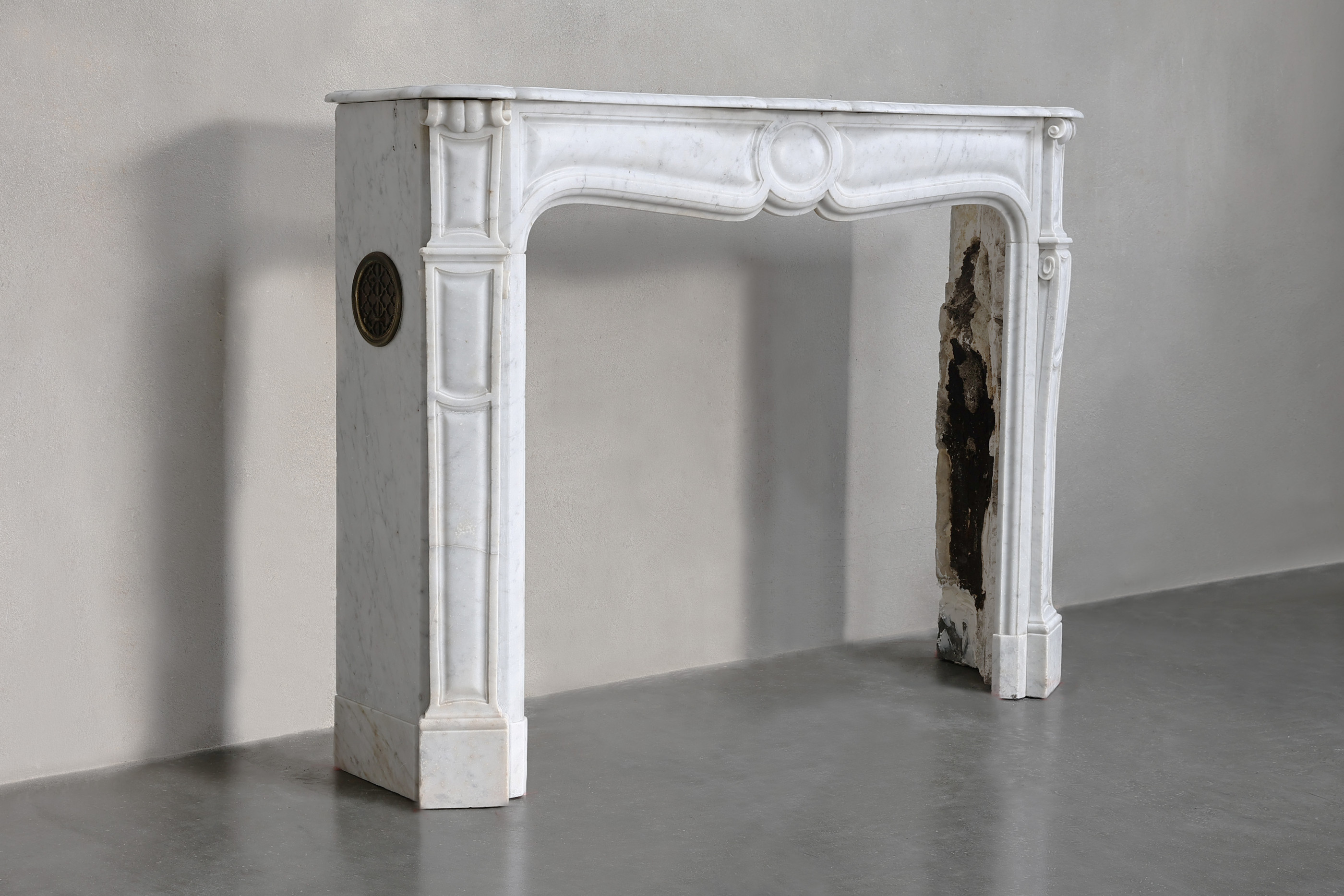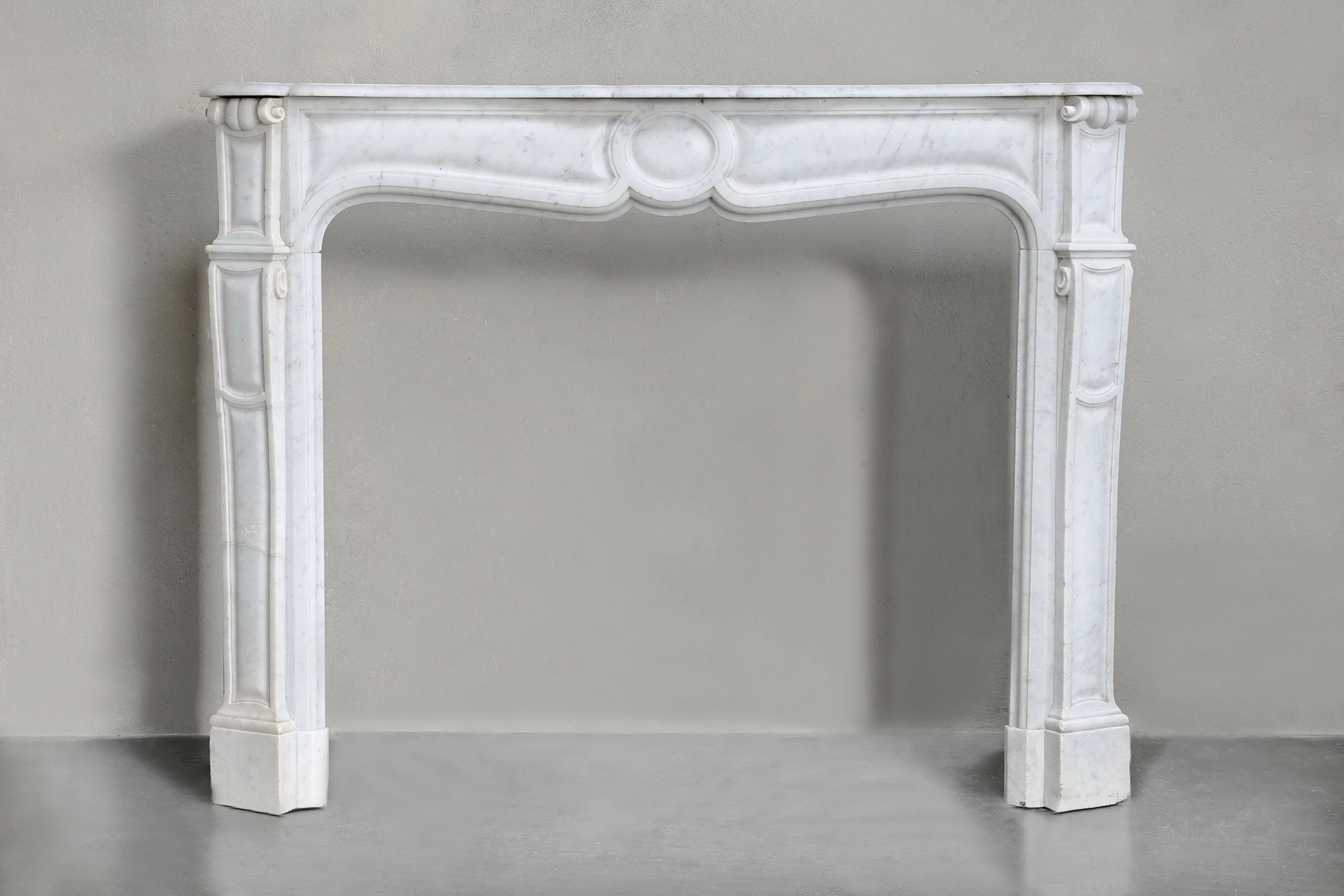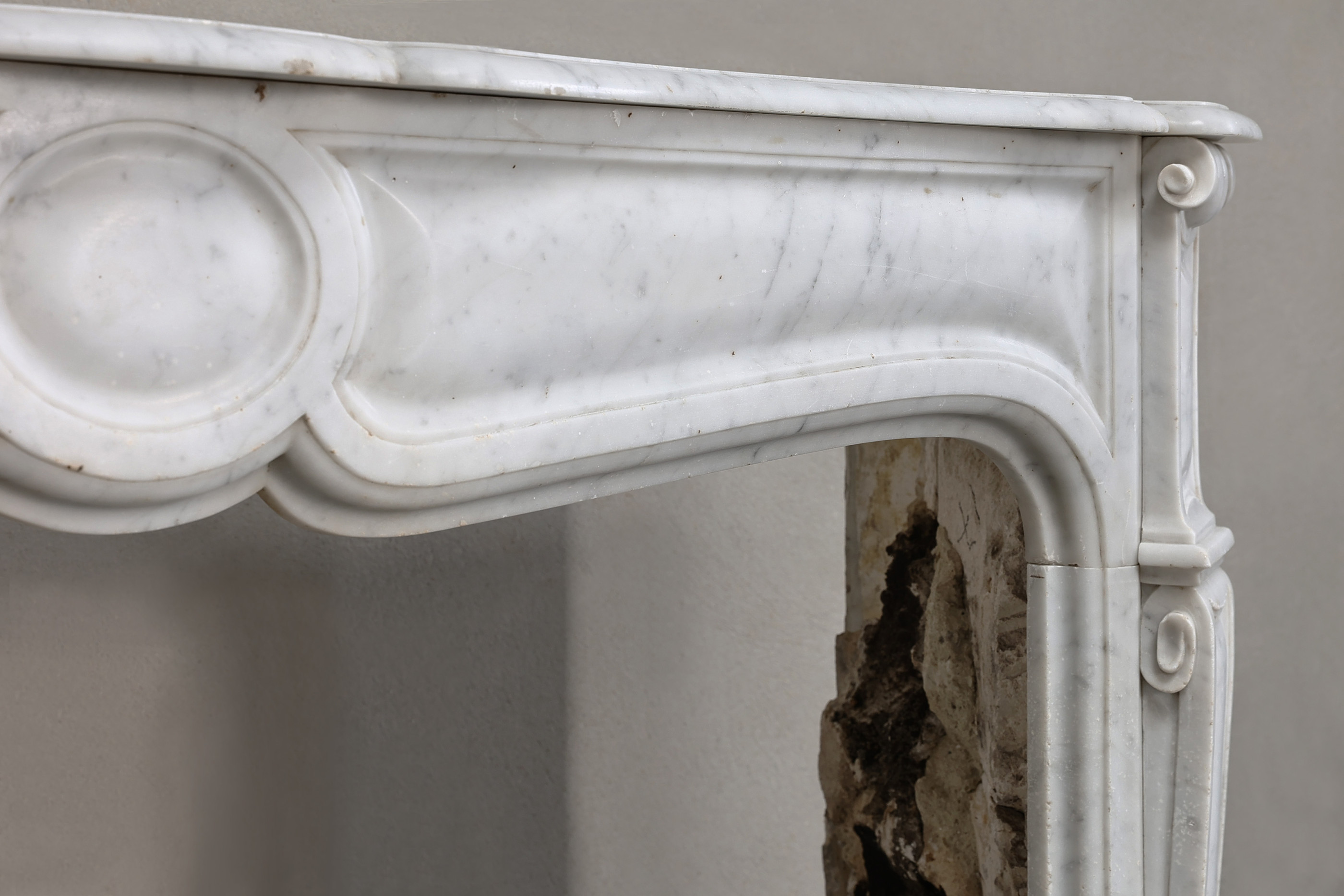 Wunderschöner kompakter antiker Kaminsims aus Carrara-Marmor aus dem 19. Jahrhundert! Dieser anmutige Mantel ist im Pompadour-Stil gehalten und zeichnet sich durch das runde Ornament in der Mitte des Vorderteils aus.