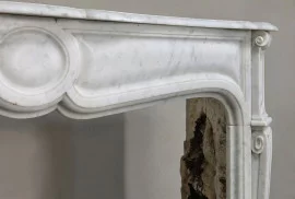 Wunderschöner kompakter antiker Kaminsims aus Carrara-Marmor aus dem 19. Jahrhundert! Dieser anmutige Mantel ist im Pompadour-Stil gehalten und zeichnet sich durch das runde Ornament in der Mitte des Vorderteils aus.