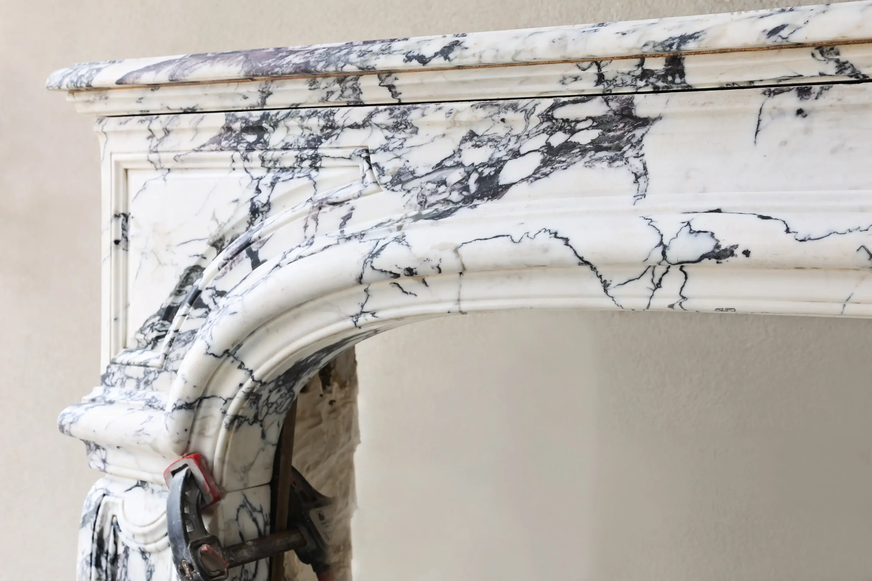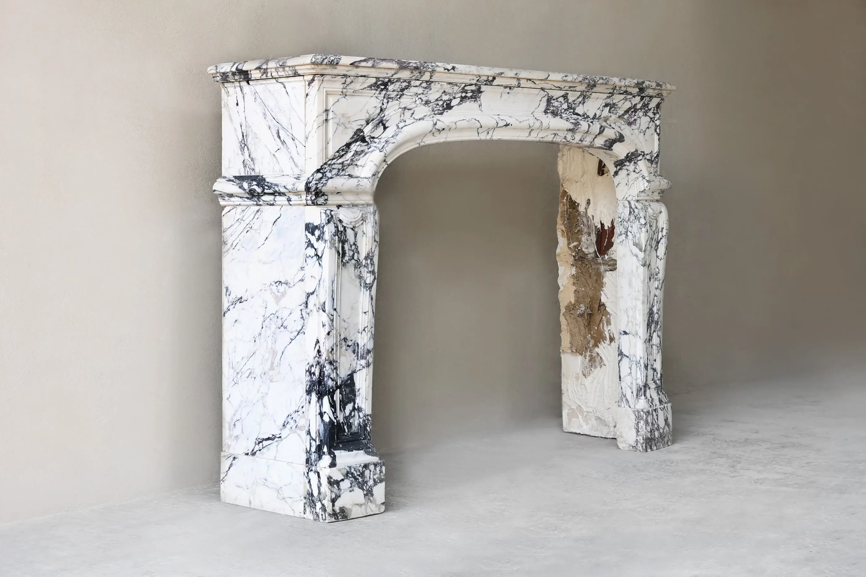 Dieser Antike marmor Kamin ist eine französische Einzelanfertigung aus dem 19. Jahrhundert, gefertigt aus Paonazzo-Marmor mit kontrastreicher Aderung. Für Planung und Ausführung sind klare Proportionen und verlässliche Maße entscheidend—die vier Bilder zeigen die Front, eine schräge Ansicht sowie Details beider oberen Ecken.