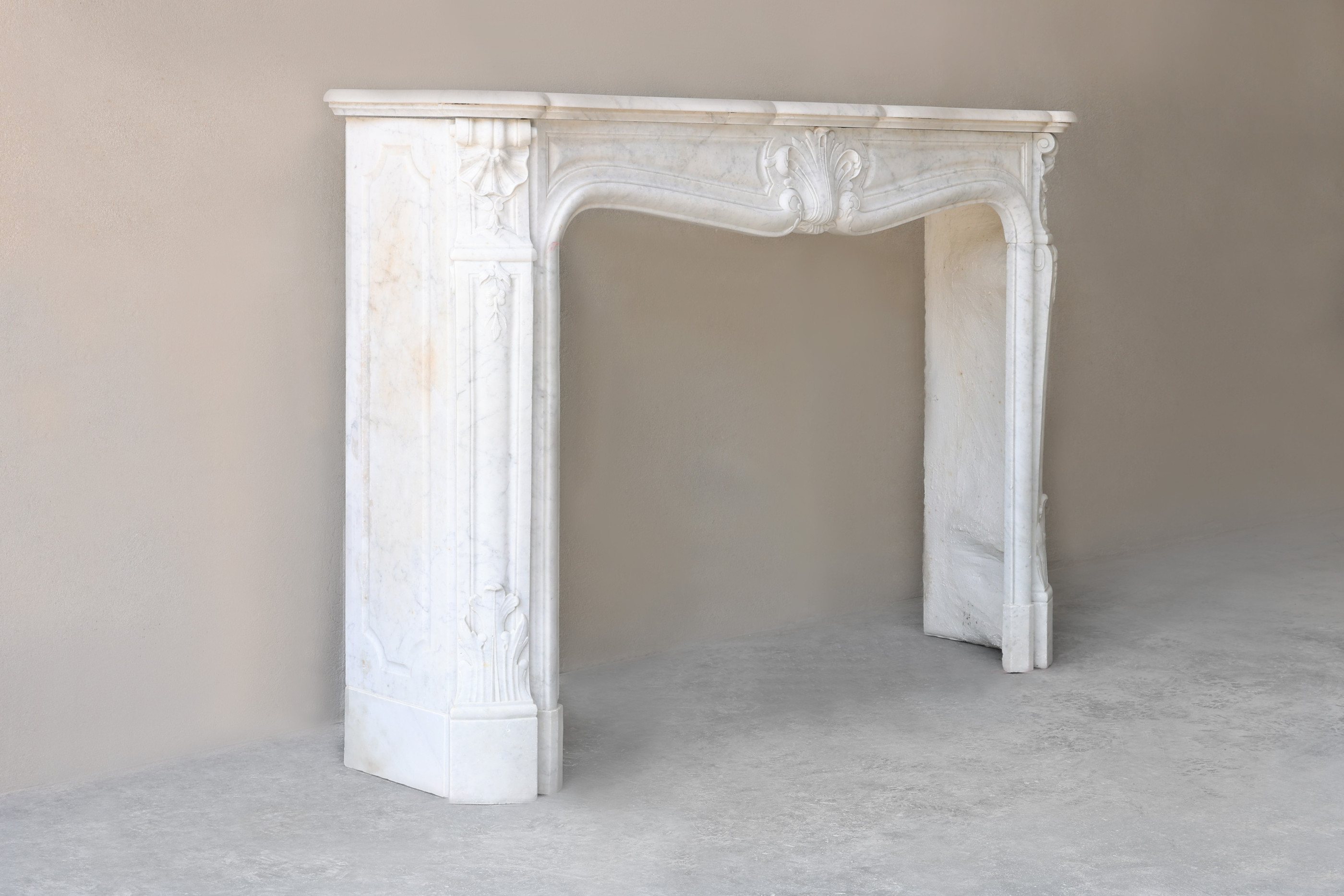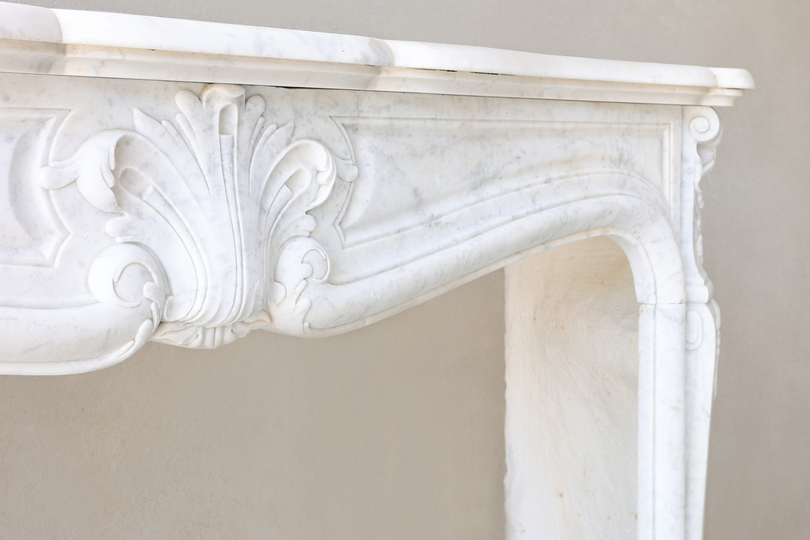 Dieser seltene Kaminmaske im Louis-XV-Stil aus dem 19. Jahrhundert ist mit Finesse aus edlem Carrara-Marmor gefertigt. Die eleganten Rokoko-Linien, die anmutigen Muschelmotive und die raffinierten Details strahlen französische Grandezza aus. Ein wunderschöner, kompakter Kamin mit elegantem Erscheinungsbild, der in viele Innenräume passt.