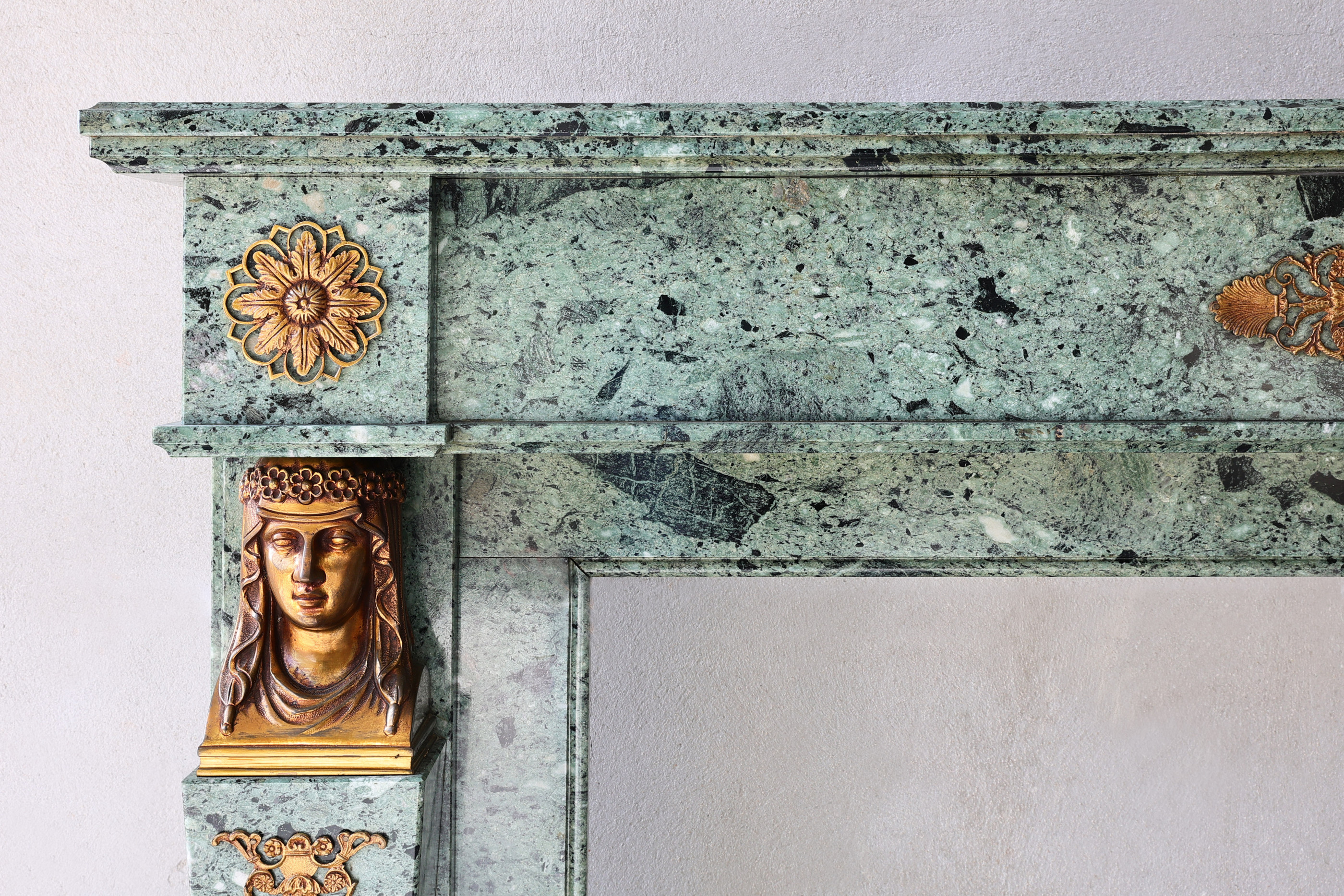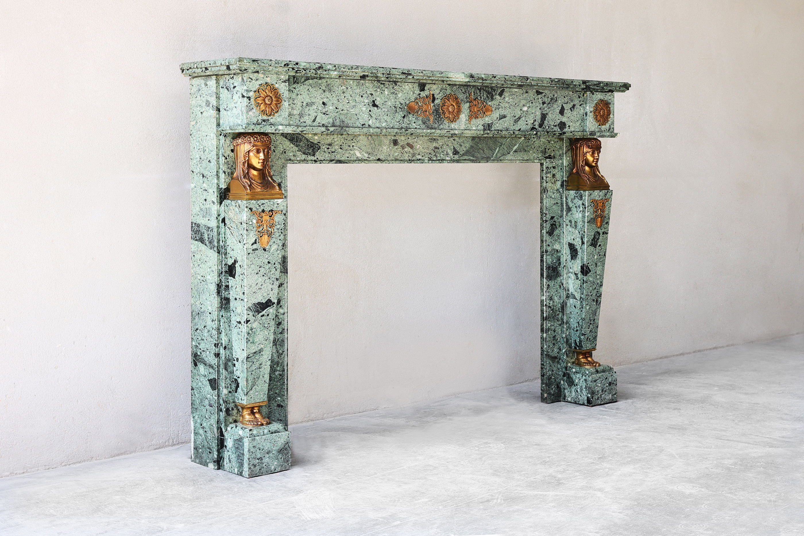 Ganz besonderer antiker Kamin der griechischen Marmorart 'Vert de Grece'. Dieser Kamin ist im Empire-Stil und stammt aus dem späten 19. Jahrhundert (1890-1910). Der Ursprung dieses Kamins ist Frankreich - Lille. Die schöne Kombination aus Bronzestatuen und griechischem Marmor macht diesen Kamin selten!
