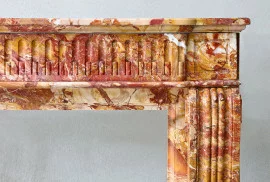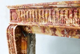 Wunderschöner, farbenfroher antiker Kamin aus Marmor von Breche de Saint Maxim. Dieser Kaminsims stammt aus dem 19. Jahrhundert und weist im vorderen Teil des Kamins und an den Beinen eine wunderschöne handgeschnittene Verarbeitung auf! Ein Kamin mit Reiz und Aussehen, der aufgrund seiner Abmessungen in vielen Innenräumen einsetzbar ist.