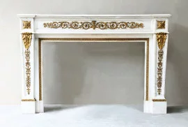 Sehr schicker antiker Kamin aus Carrara-Marmor mit vergoldetem Gold. Ein eleganter Kamin mit wunderschönen Ornamenten und Verzierungen aus vergoldetem Gold im vorderen Teil und weiter an den Beinen. Dieser Kamin aus dem 19. Jahrhundert ist im Stil von Louis XVI gehalten und wir haben ihn aus einer Wohnung in Paris mitgenommen und sind eine Bereicherung für unsere Sammlung antiker Kamine.