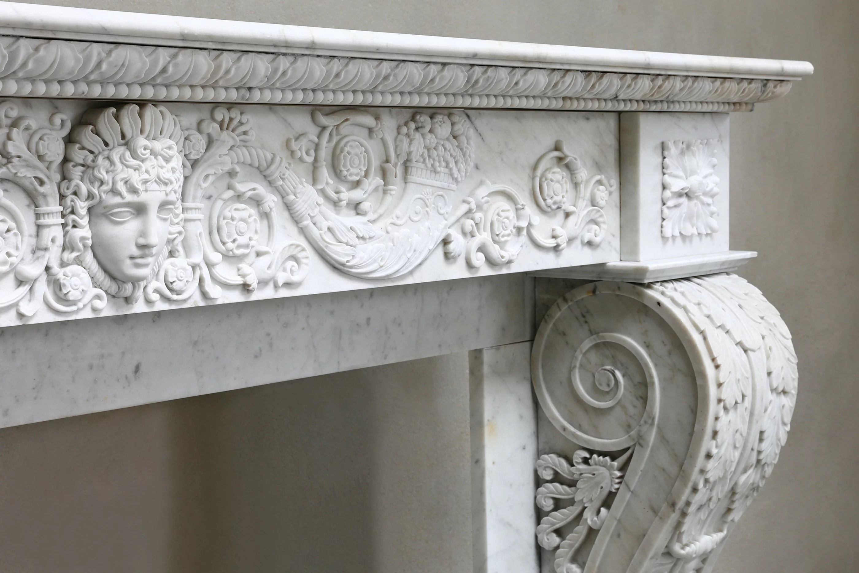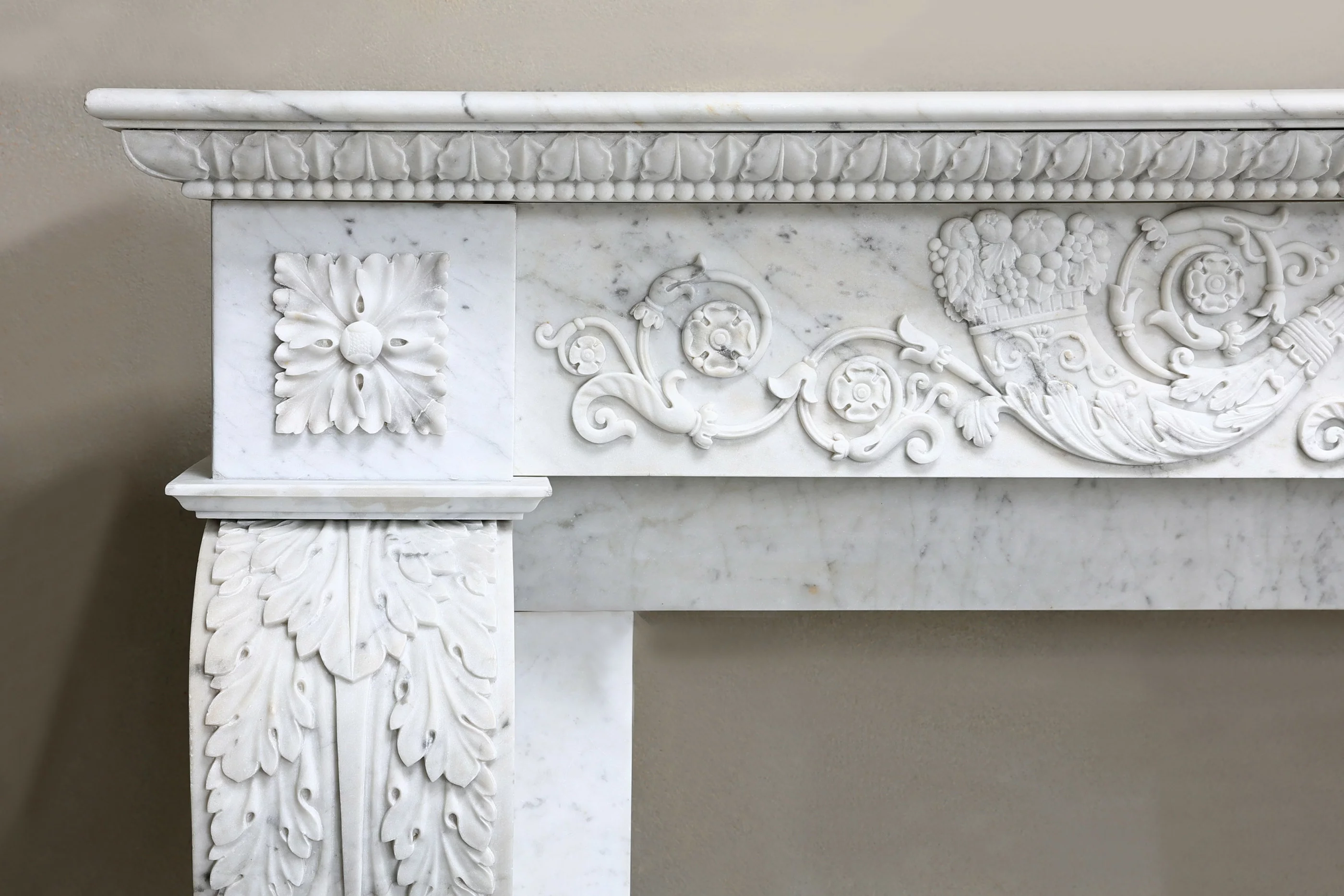 Wunderschön gefertigter antiker Kamin aus Carrara-Marmor. Dieser Kamin hat besondere Verzierungen und Verzierungen und sieht sehr schick aus! Die Beine sind gebieterisch und anmutig. Ein Kamin aus dem 19. Jahrhundert im Stil von Louis XVI. Ein besonderer Kamin mit einer angemessenen Breite von mindestens 165 cm.