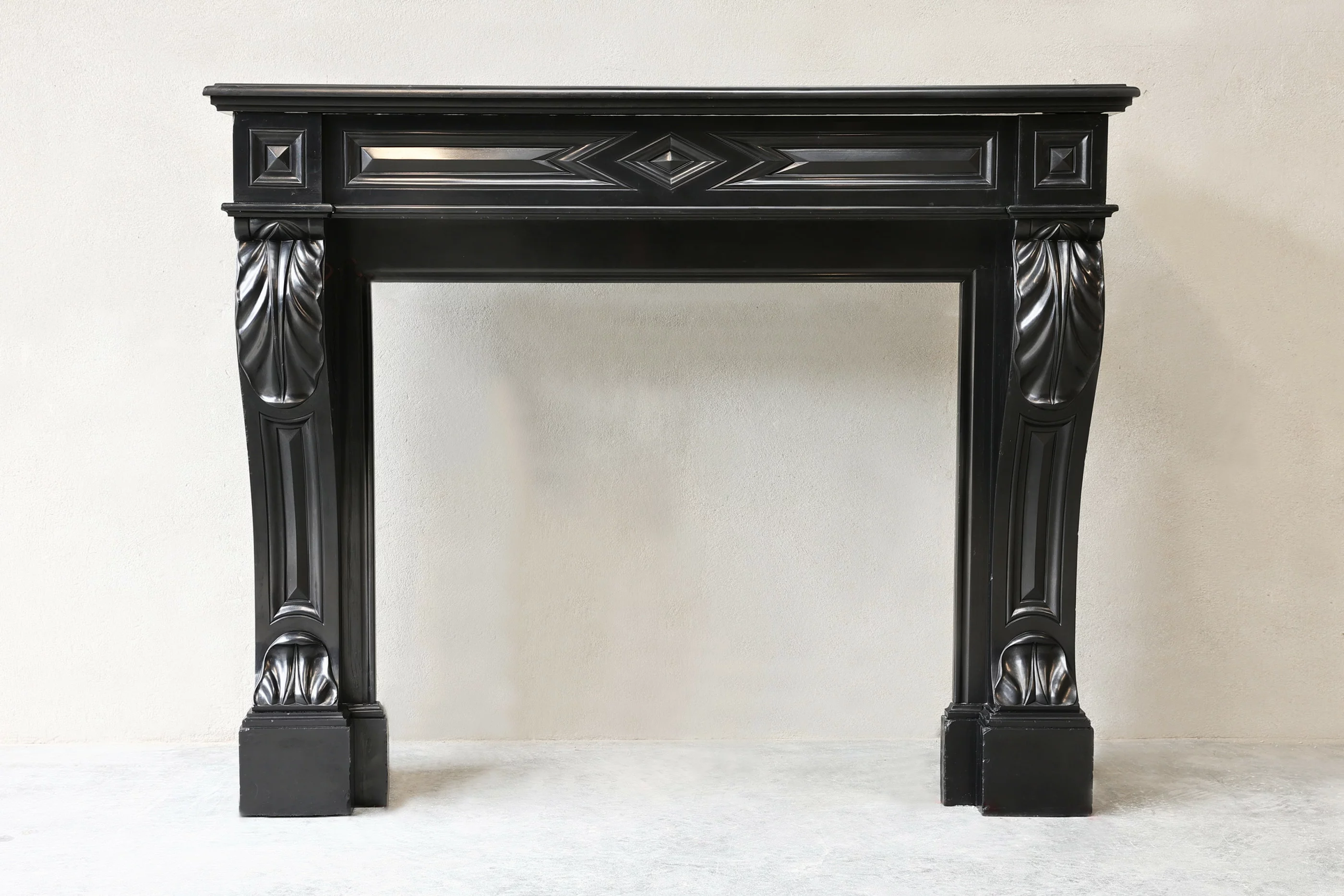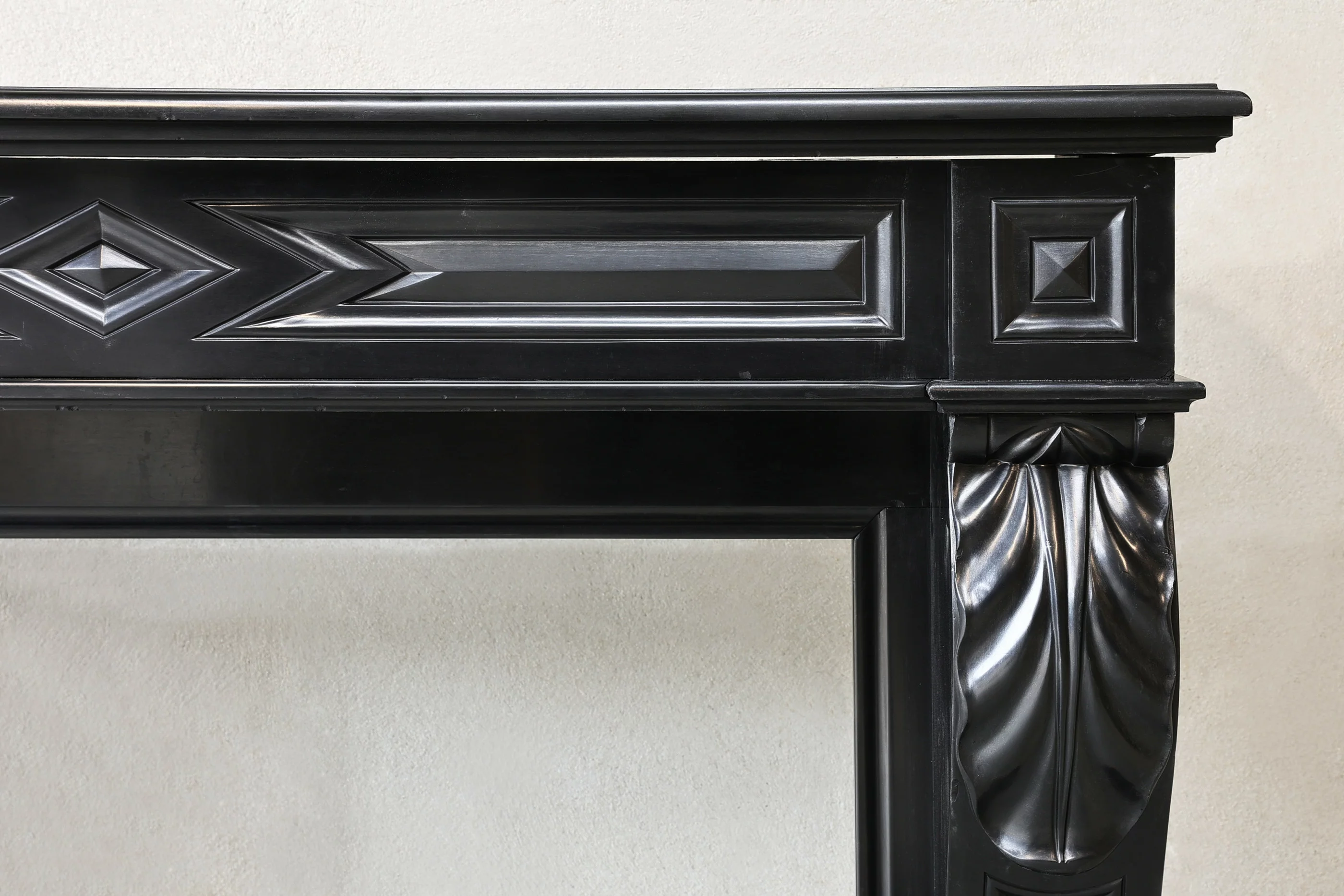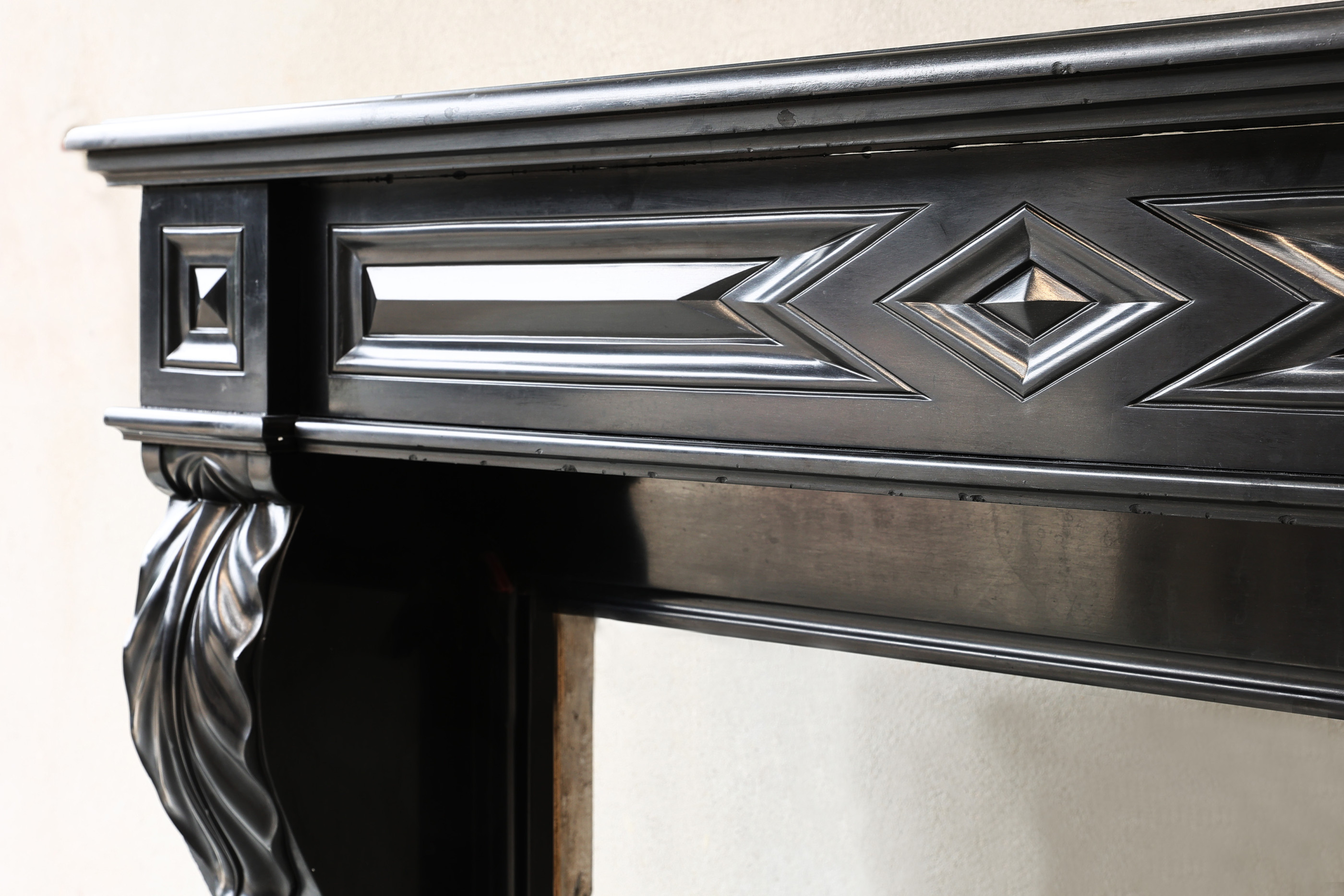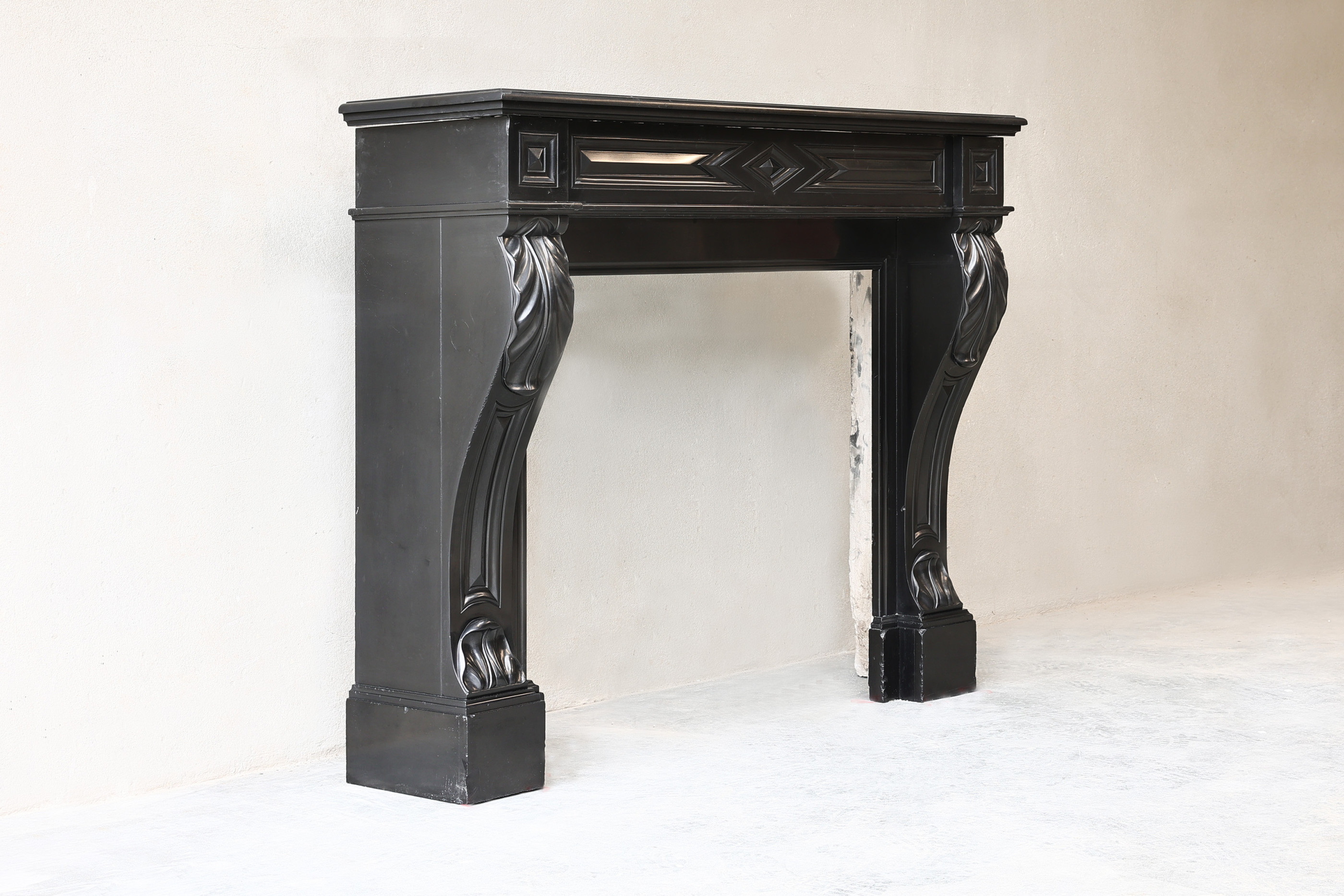Wunderschöner antiker Kaminsims aus Noir de Mazy-Marmor mit schönen Kurven und Ornamenten. Dieser Kamin stammt aus dem 19. Jahrhundert und ist im Stil Ludwigs XVI. gehalten. Ein schwarzer Kamin sieht immer schick aus und passt auf jeden Fall zu diesem Kaminsims mit Rundungen an den Beinen und Verzierungen an der Oberseite und an den Beinen.