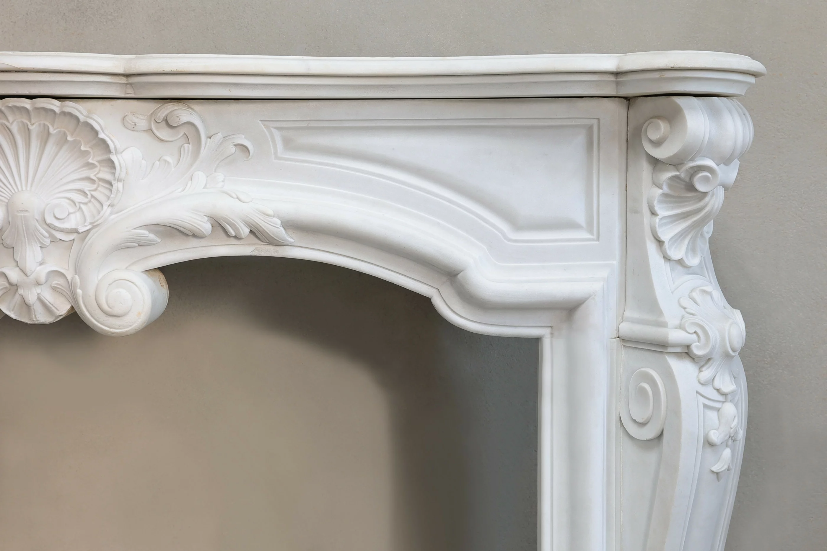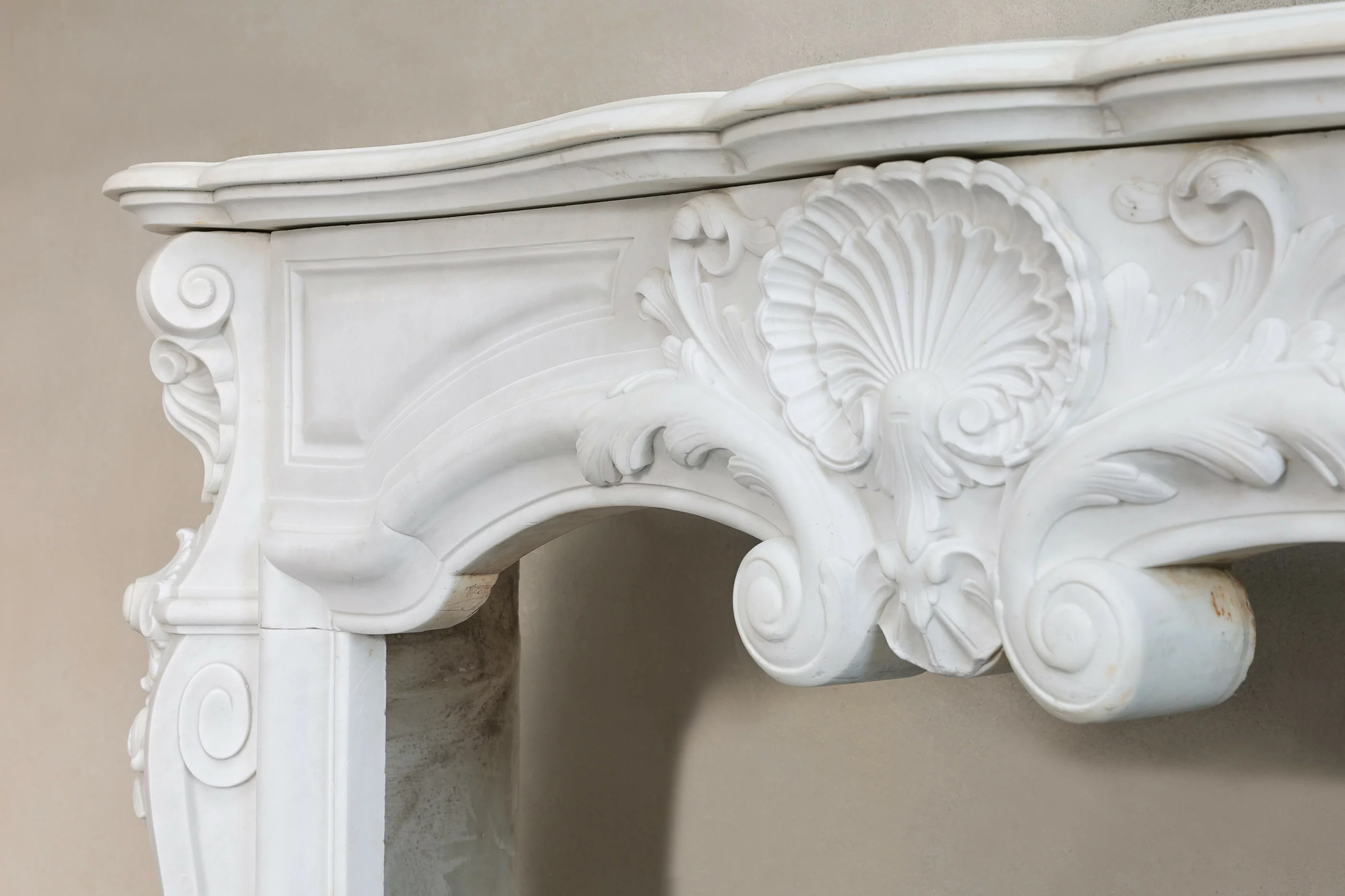 Wunderschöner, eleganter Kaminmaske mit anmutigen Elementen wie einer Muschel in der Mitte des Vorderteils und an den Seiten, Akanthusblättern und schönen Linien. Ein sehr schöner antiker Kamin, der in vielen Innenräumen zur Geltung kommt und einen Mehrwert schafft!