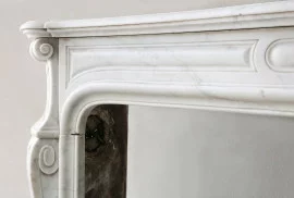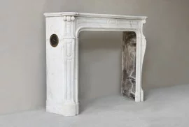 Der Kamin ist aus feinkörnigem Carrara-Marmor gearbeitet, einem Naturstein, der seit Jahrhunderten in der europäischen Architektur Verwendung findet. Der Pompadour-Stil ordnet das Objekt in die französische Innenarchitektur des 19. Jahrhunderts ein, geprägt von ausgewogenen Proportionen und zurückhaltender Ornamentik.
