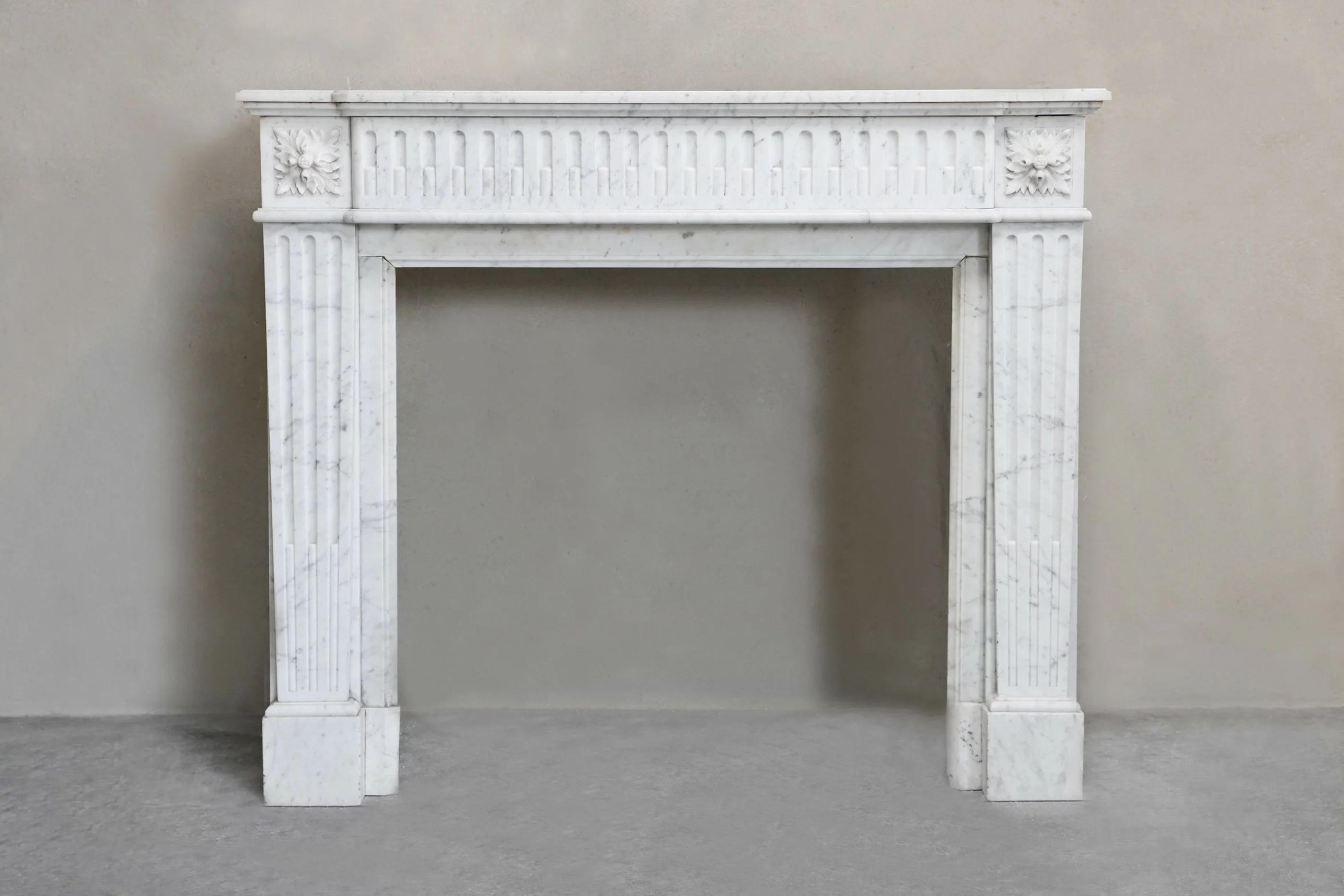 Wunderschöner antiker Kaminmaske aus dem 19. Jahrhundert im Louis XVI-Stil, gefertigt aus hochwertigem Carrara-Marmor. Dieser antike Kamin hat eine gerade Form, die sich durch gerade Linien, Symmetrie und reiche Kannelierung auszeichnet, die diesem Kamin einen zeitlosen Charakter verleiht. Ein authentischer und stilvoller Kamin, der für Atmosphäre und ein historisches Erscheinungsbild sorgt.