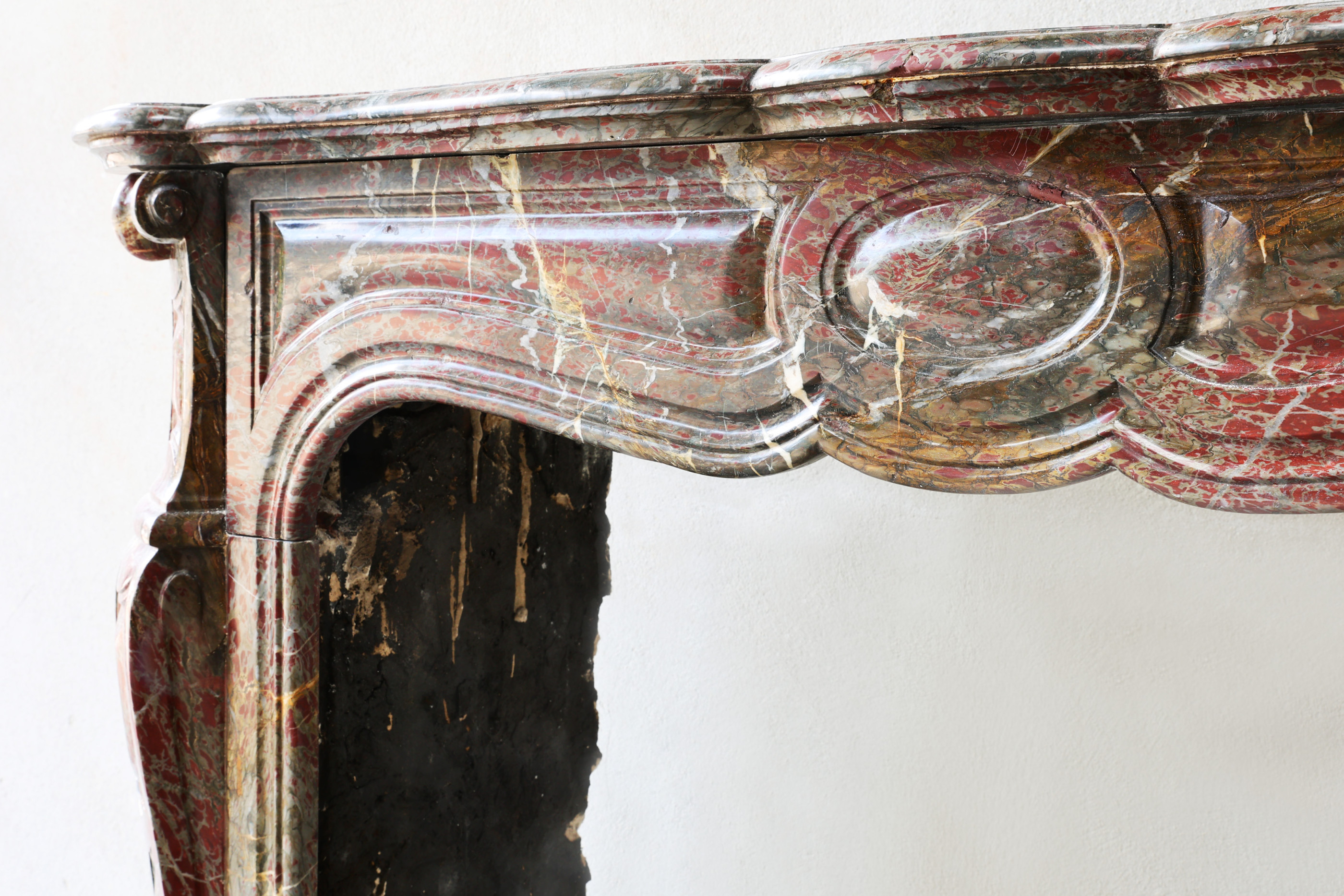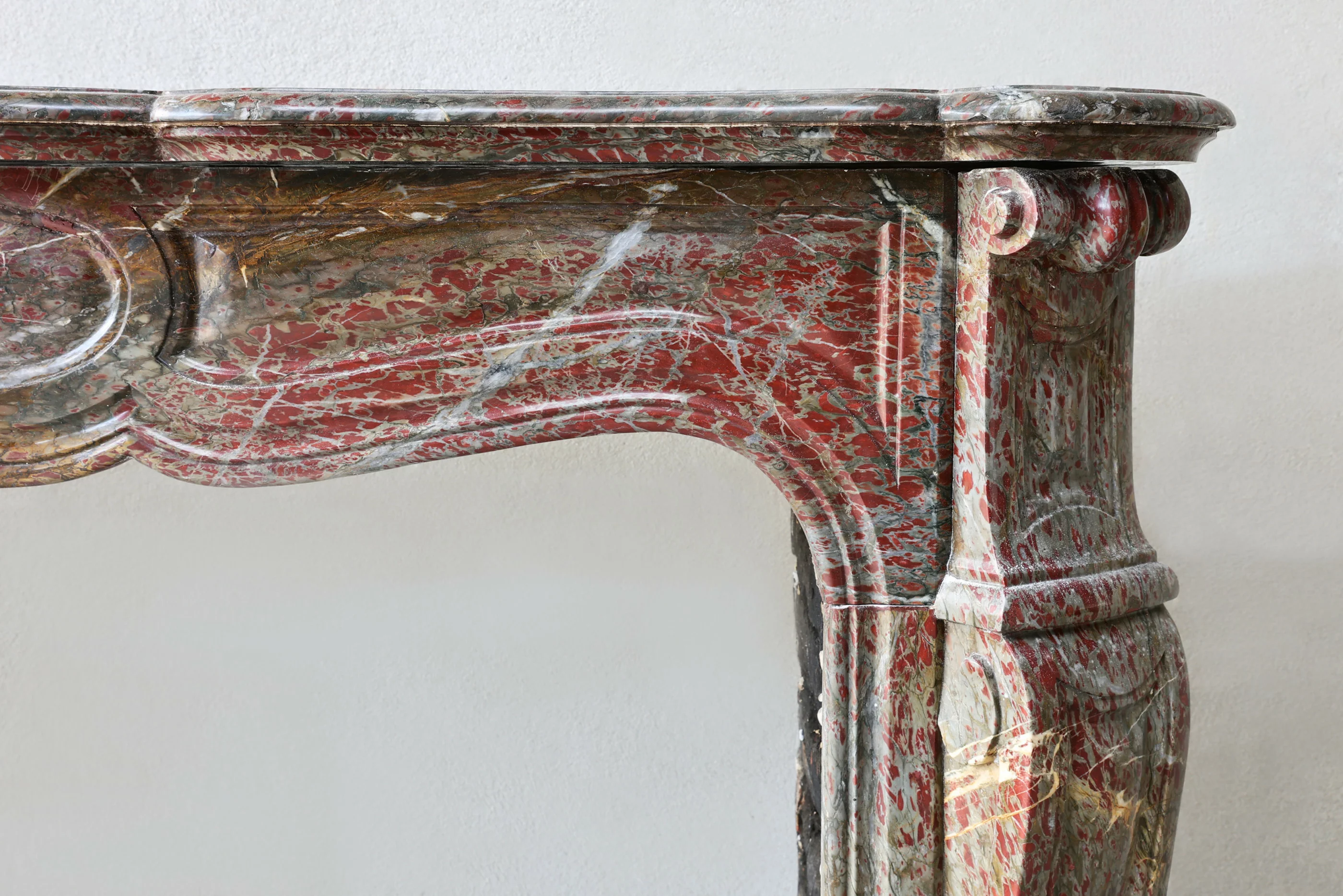 Dieser elegante antike Kamin im Pompadour-Stil wurde aus dem seltenen Campan Rouge Marmor gefertigt – einem tiefroten Naturstein mit warmen Farbtönen und feiner weißer Aderung. Die geschwungenen Linien, das weiche Profil und die zentrale Kartusche spiegeln die französische Eleganz des 19. Jahrhunderts wider.