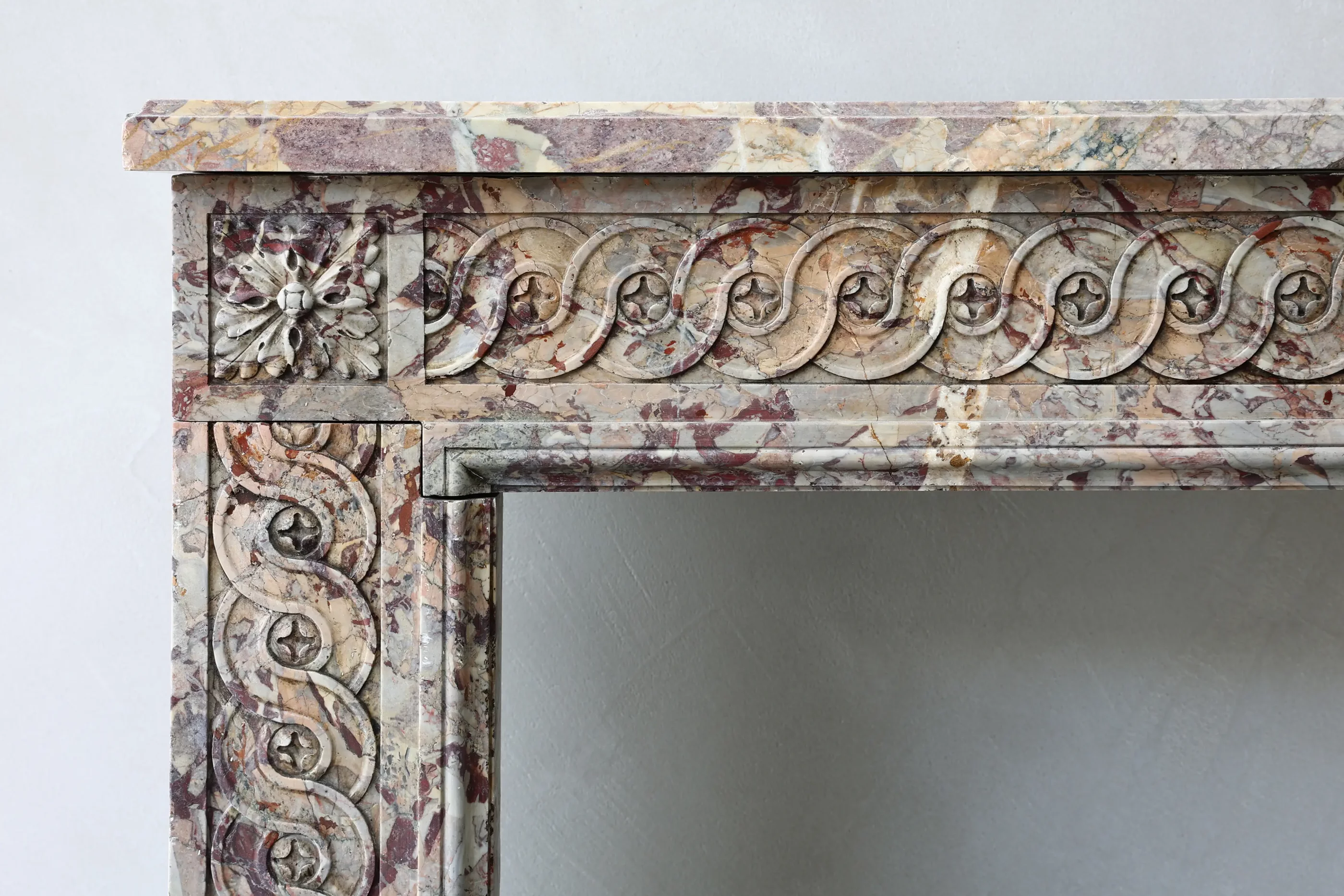 Sarrancolin-Marmor aus den französischen Pyrenäen ist bekannt für seine vielfältigen Farbnuancen in Rot-, Creme- und Grautönen sowie seine lebendige Maserung. Dies verleiht dem Kamin eine markante und repräsentative Ausstrahlung. Die hochwertige Verarbeitung und der Einsatz von massivem Naturstein unterstreichen die Qualität und Langlebigkeit dieses Objekts.