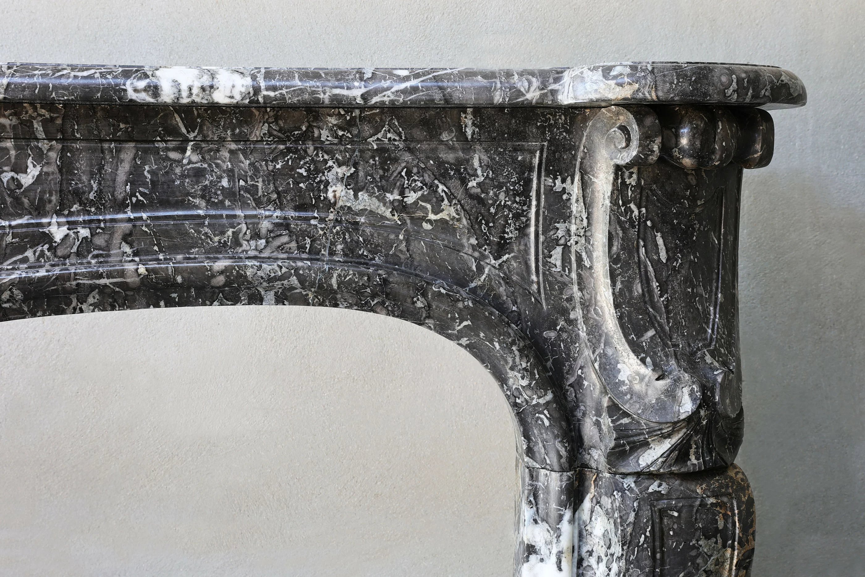 Schöner schicker antiker Kamin aus Sint Anna Marmor, einem schönen ruhigen Marmor mit hellen Adern. Dieser Kamin ist im Stil von Louis XV und stammt aus dem 18. Jahrhundert. Die schönen Adern und kunstvollen Ornamente machen diesen Kamin charmant.