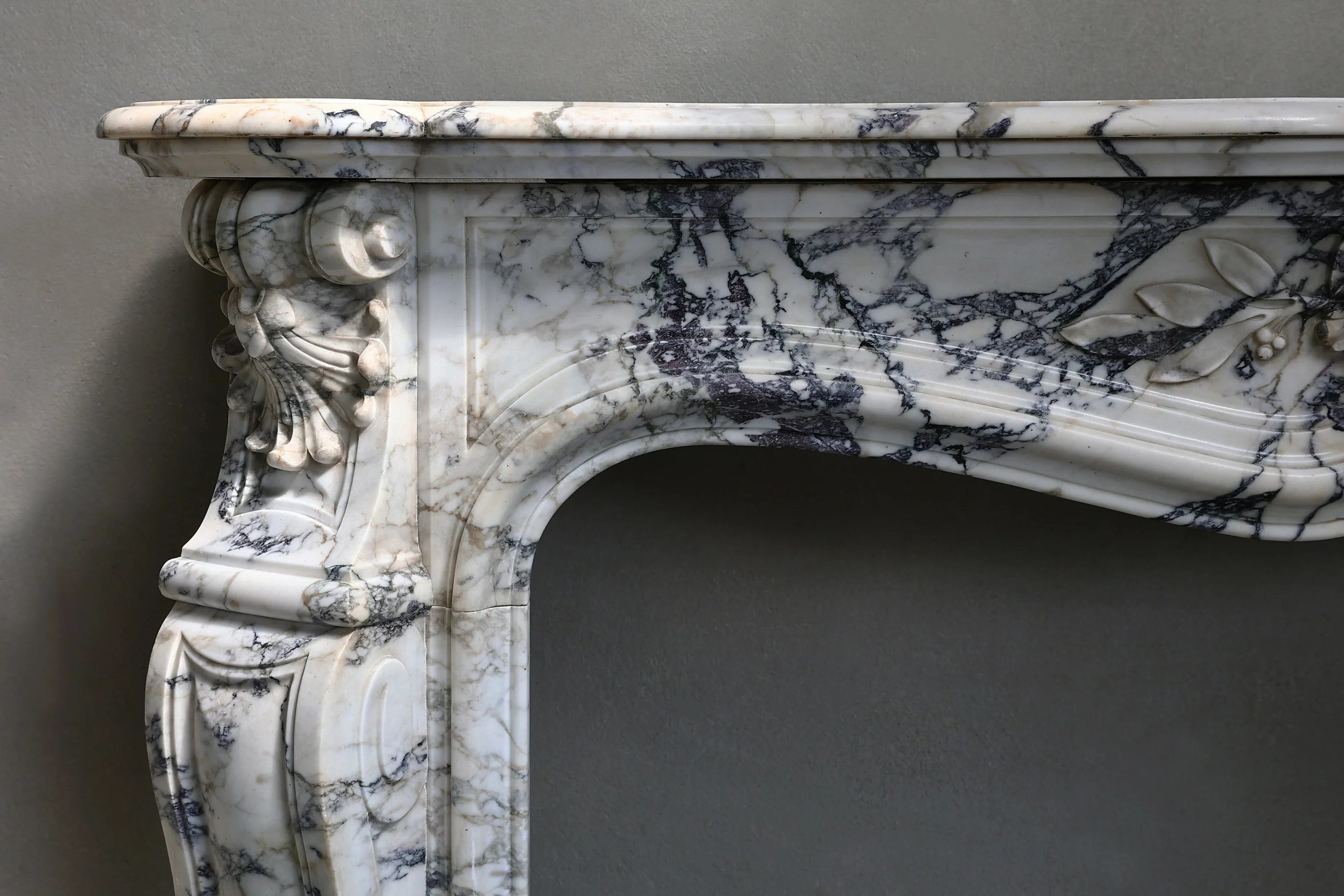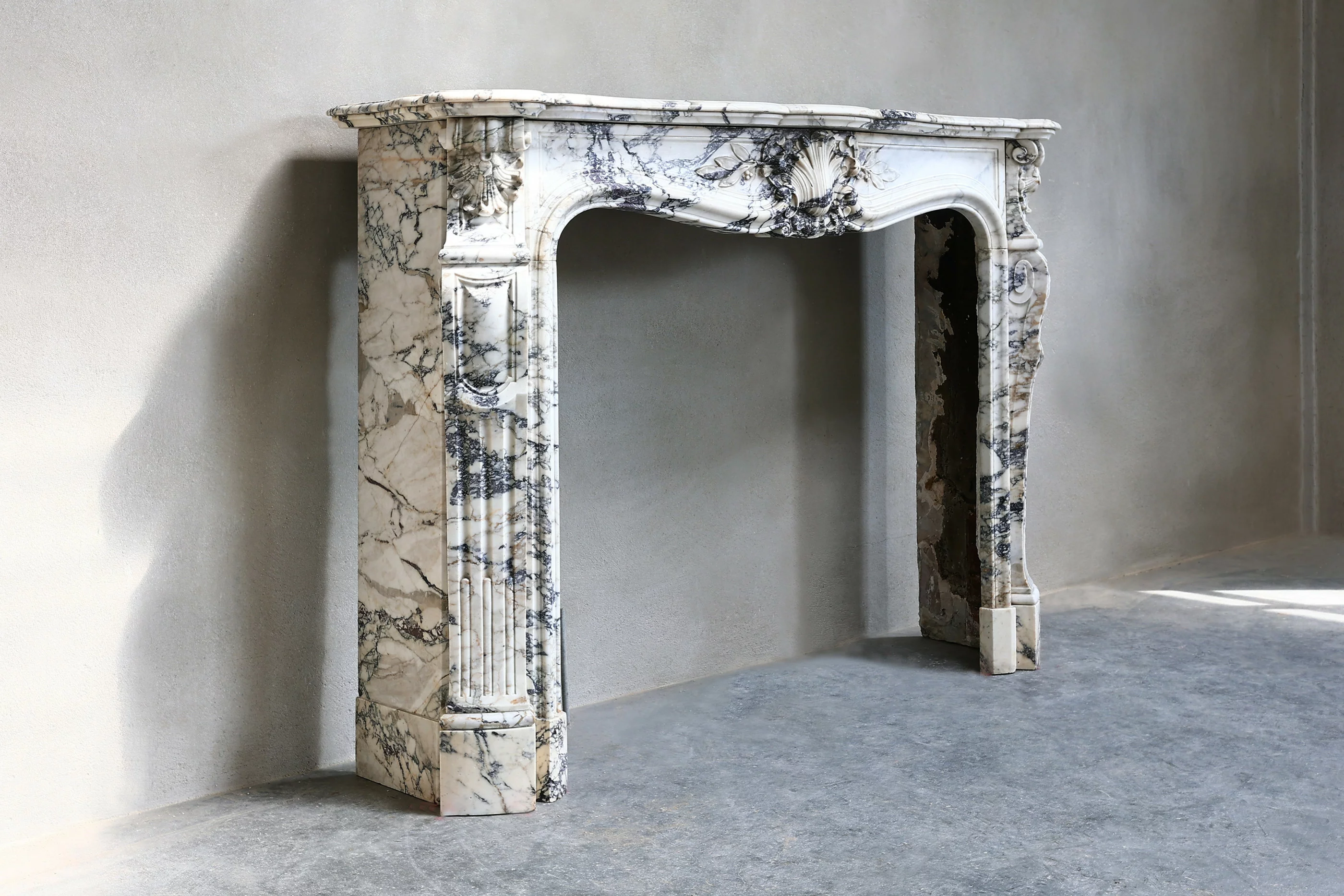 Wunderschöner einzigartiger und exklusiver Kamin aus Paonazzo-Marmor! Dieser antike französische Kamin ist im Stil von Louis XV und hat eine Muschel in der Mitte und an den Seiten des vorderen Teils. Dieser schöne Marmor mit seinen dunklen Adern ist bewundernswert!!