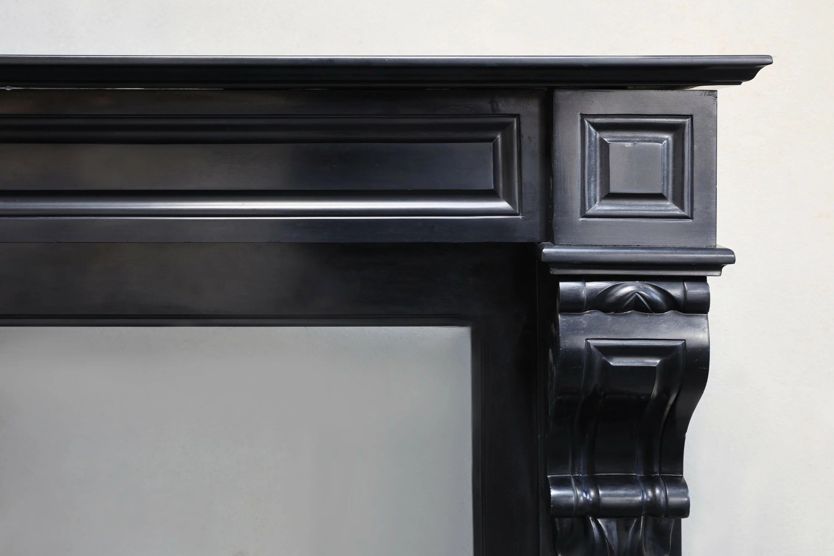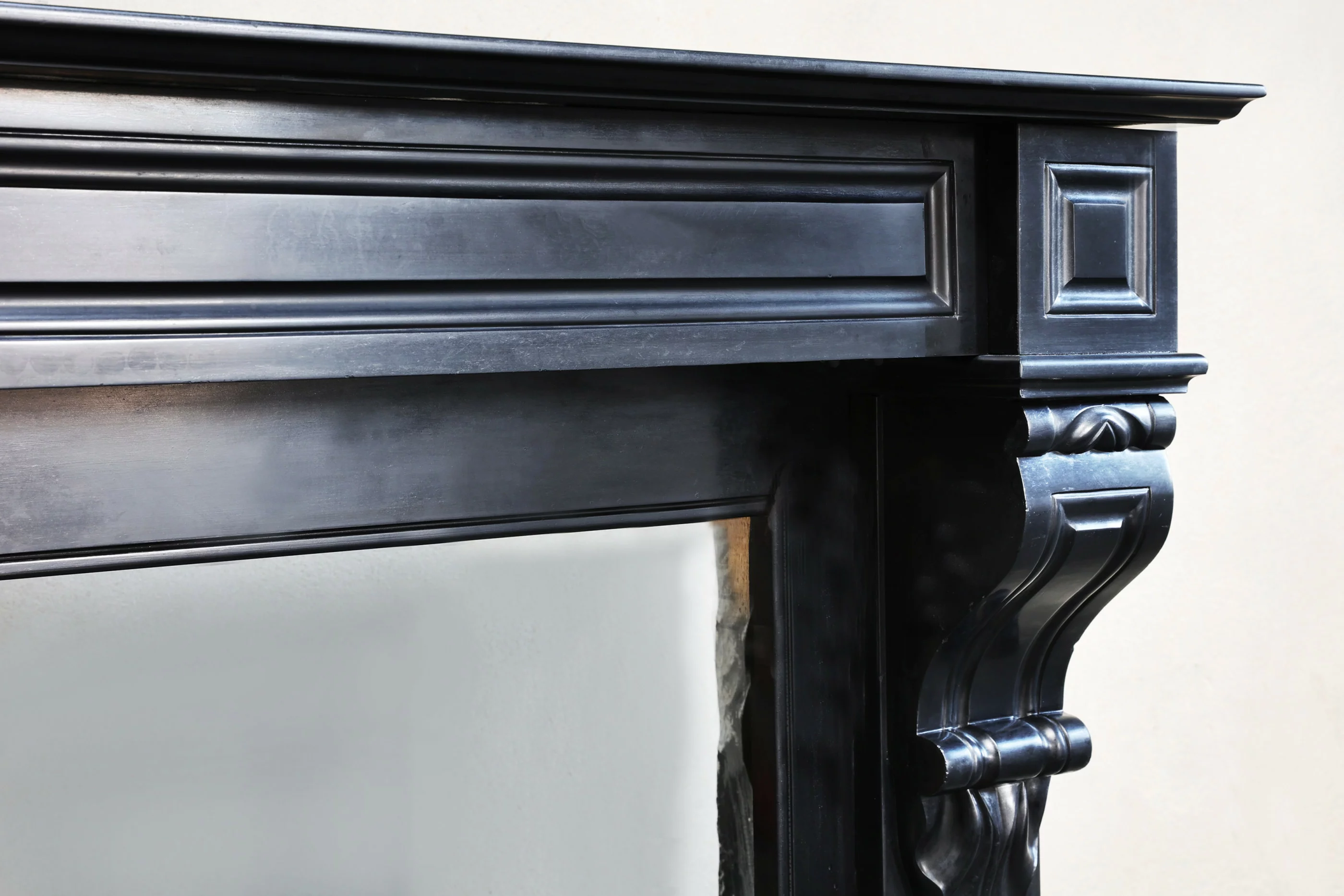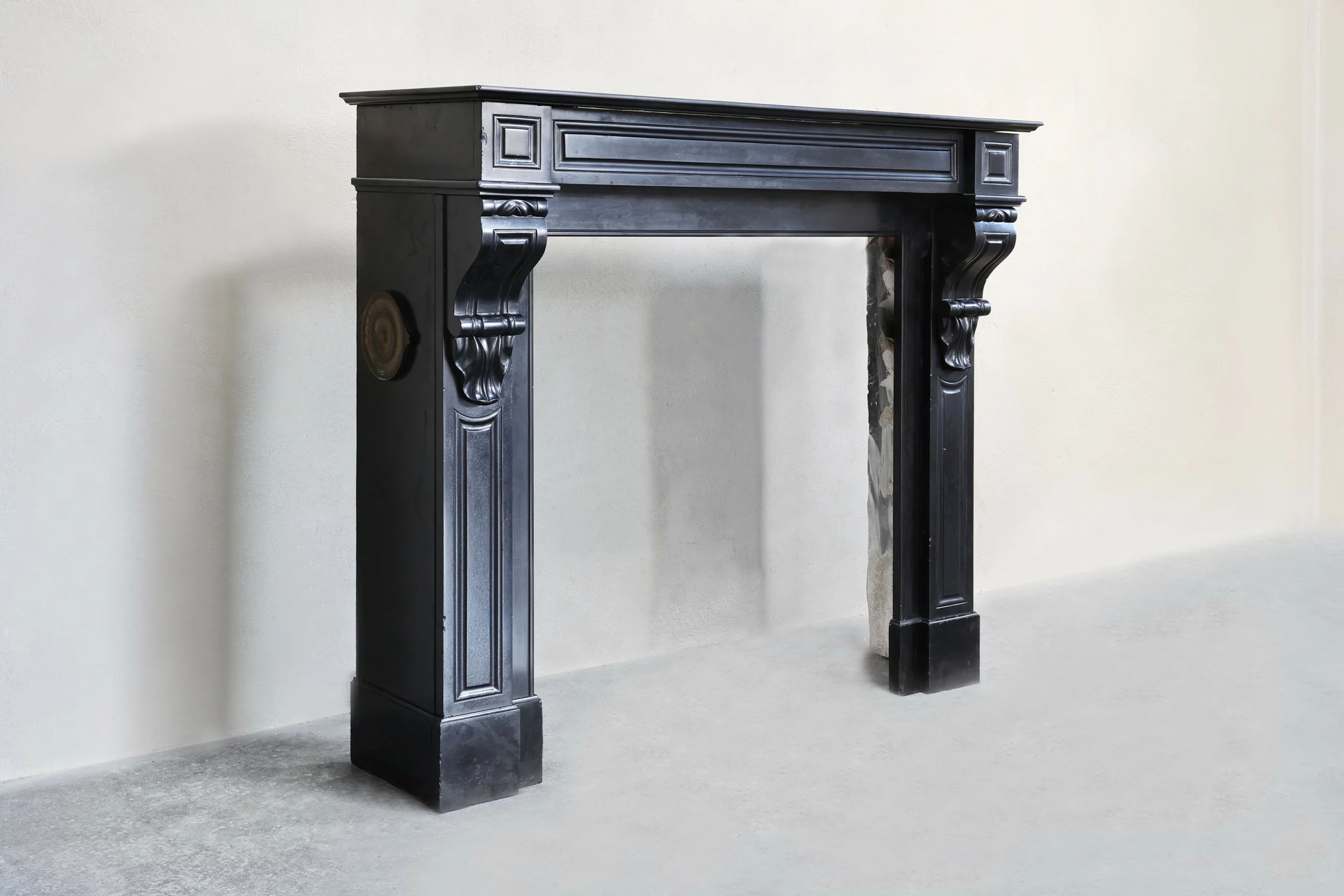 Sehr schöner antiker Kamin aus der einzigartigen Marmorart Noir de Mazy aus dem 19. Jahrhundert! Diese Marmorart aus Belgien wird immer seltener, da zahlreiche Steinbrüche bereits geschlossen wurden. Dieser Kamin ist elegant und rustikal und im Stil Ludwigs XVI. gehalten.