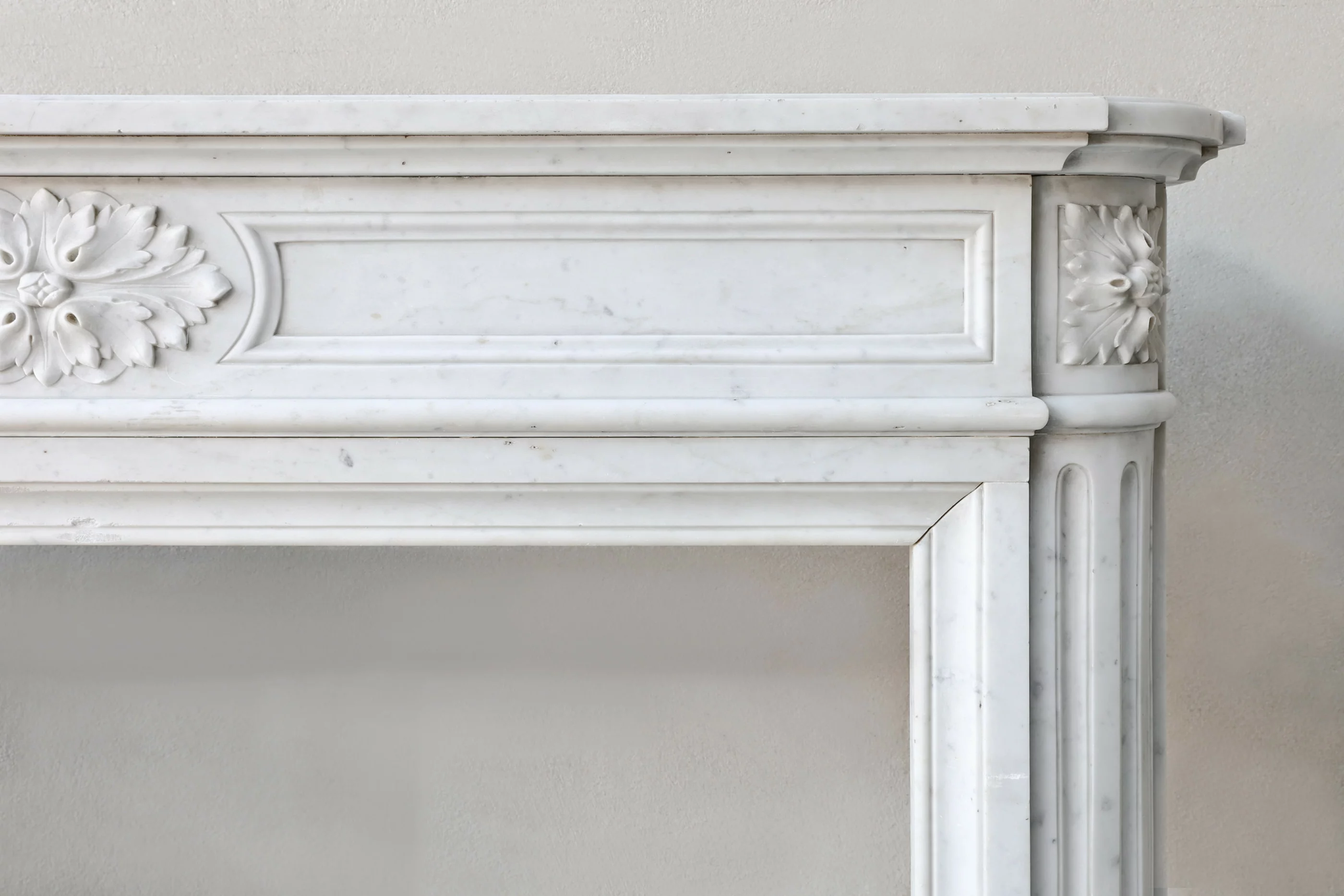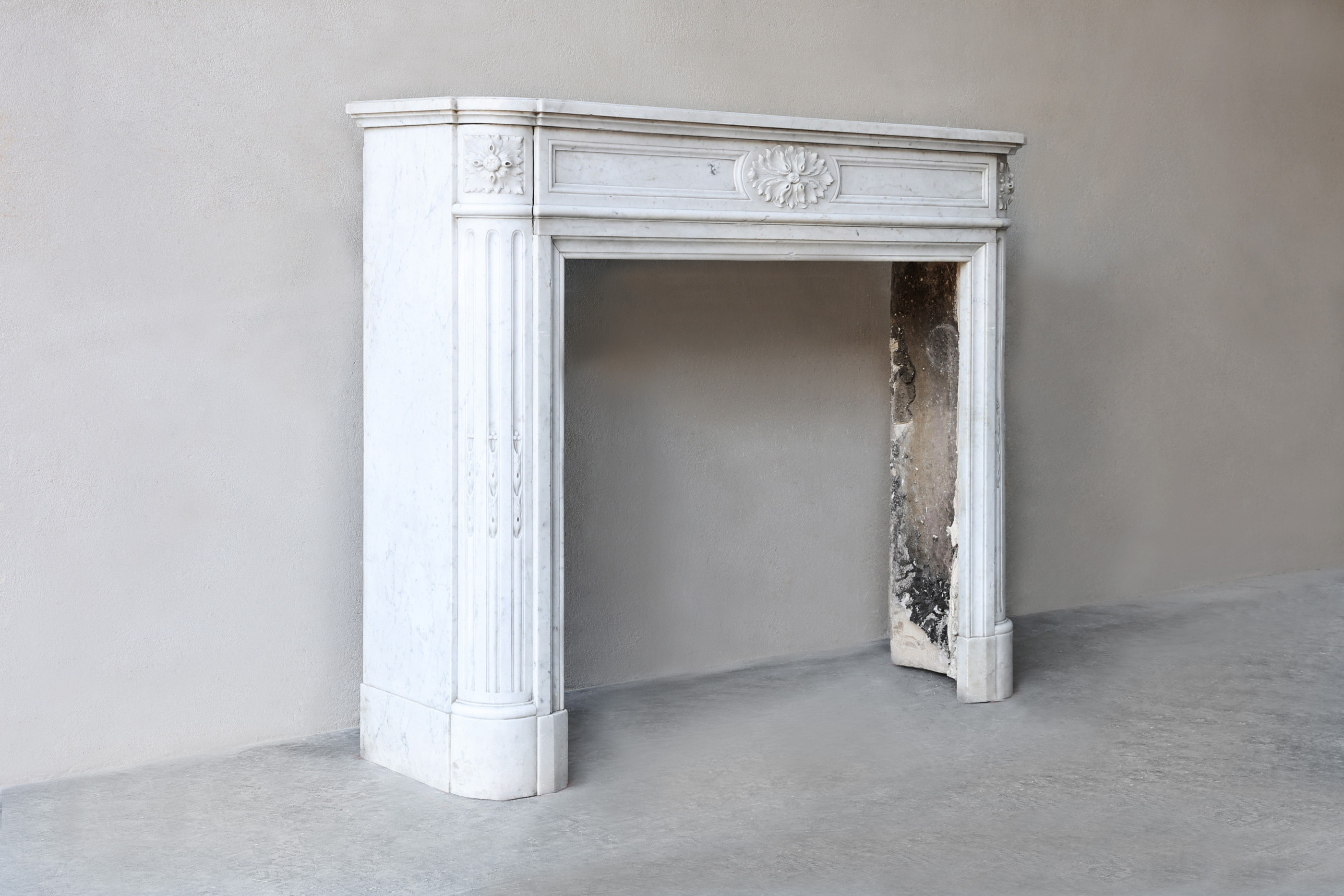 Wunderschöner kompakter Kaminmaske aus Carrara-Marmor aus Italien. Ein eleganter antiker Kamin mit Ornamenten in der Mitte auf den Beinen und runden Formen! Dieser authentischer Mantel ist im Stil von Ludwig XVI. gehalten und strahlt Geschichte und Wärme aus. Aufgrund seiner Größe passt dieser Kaminsims in viele Innenräume.
