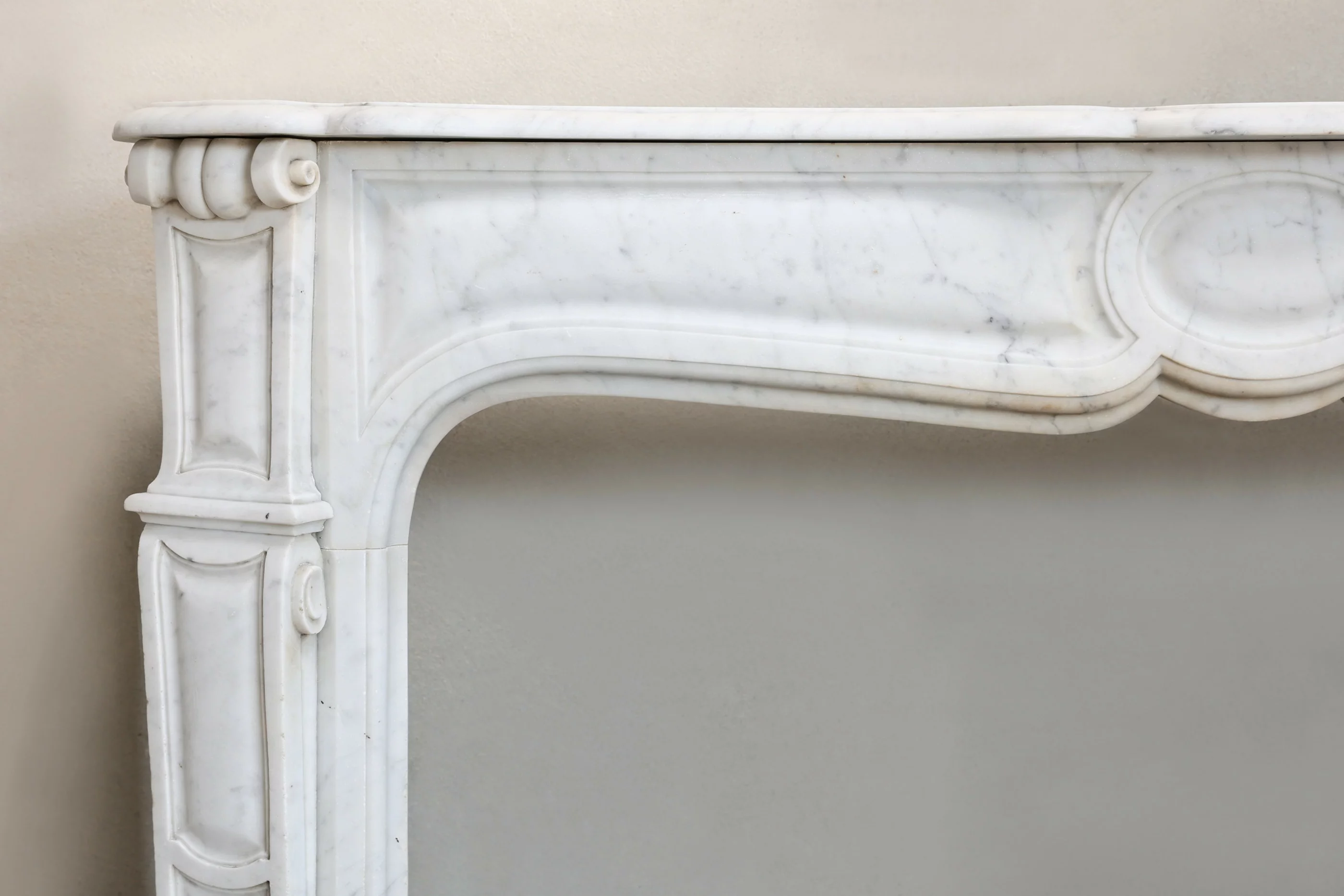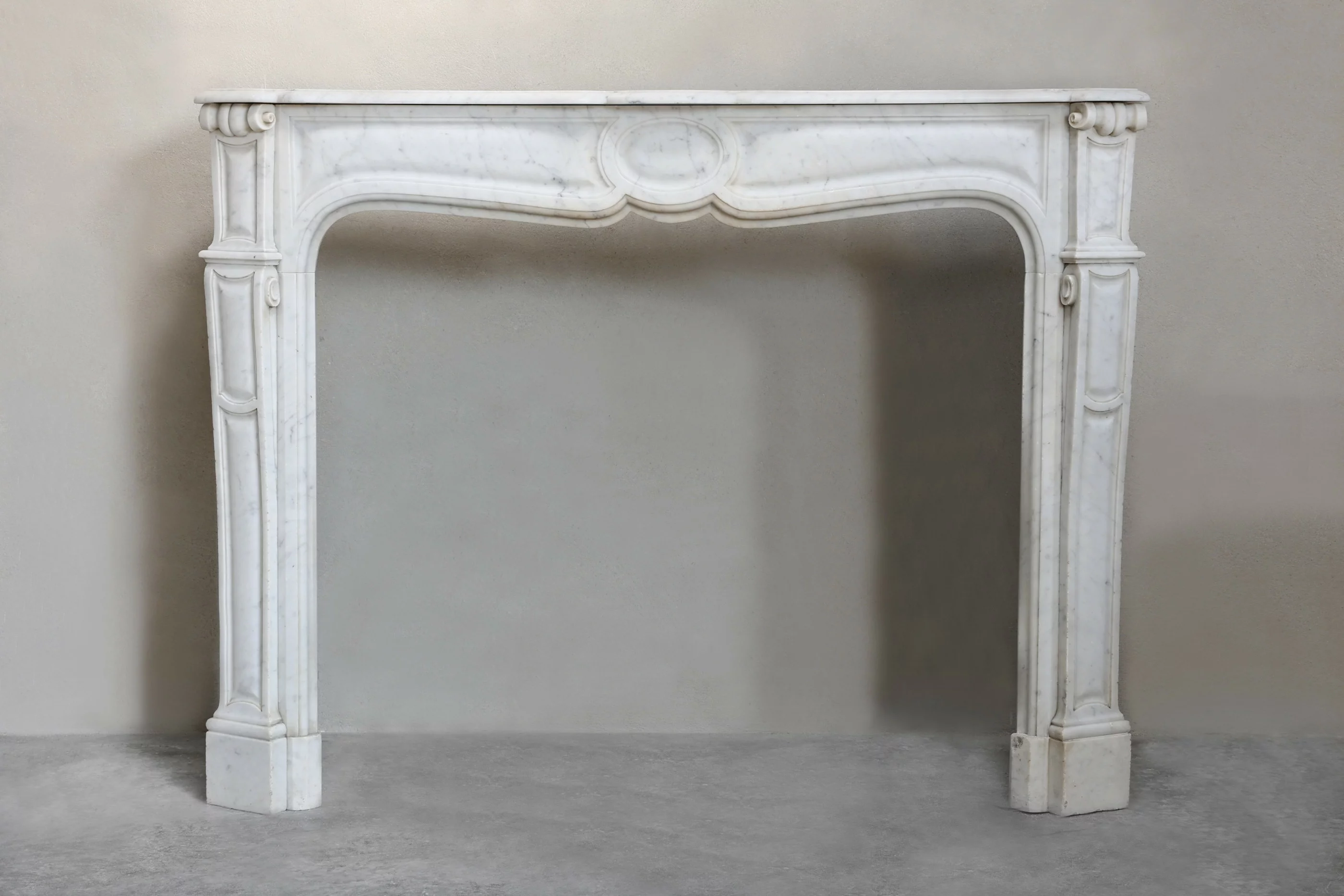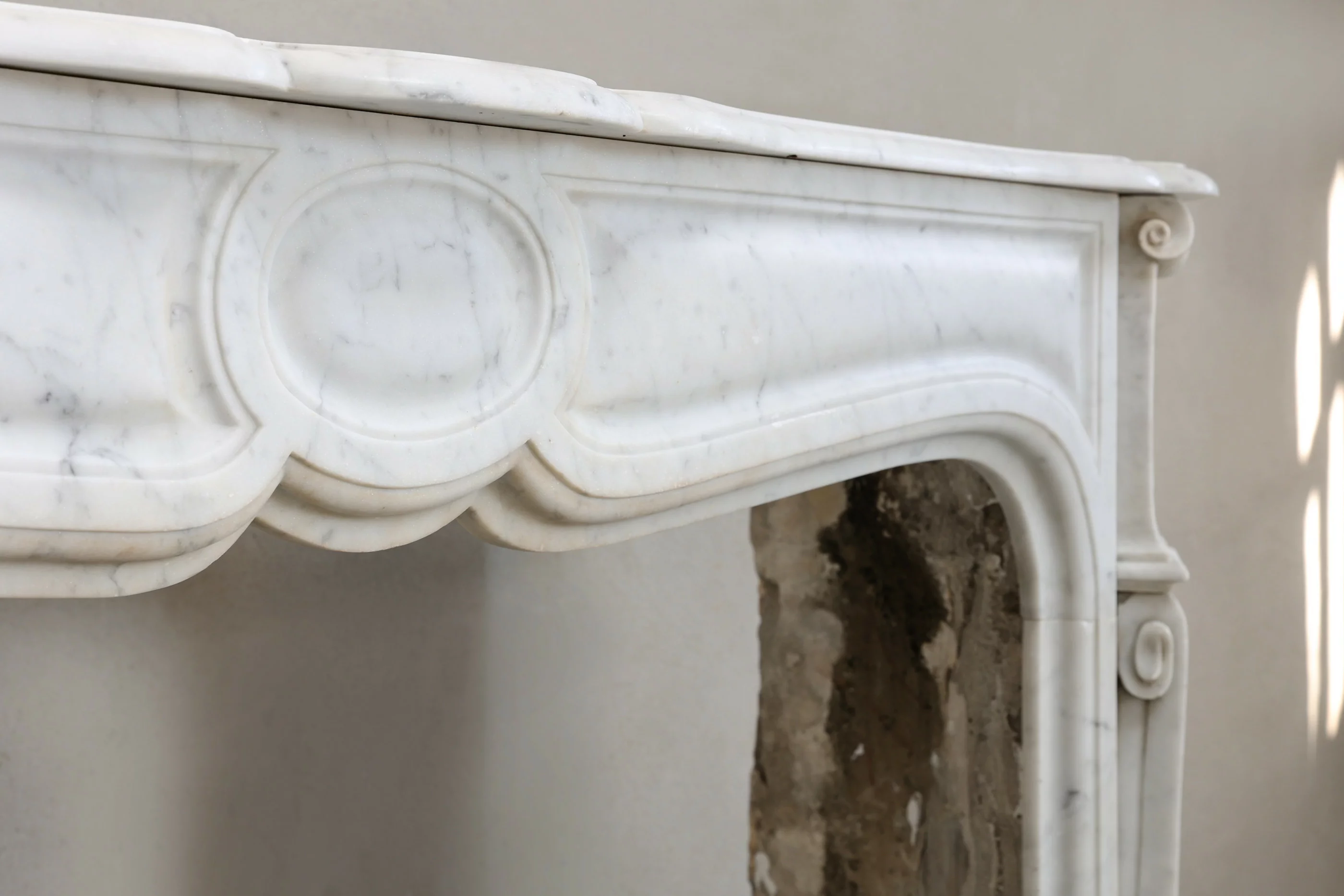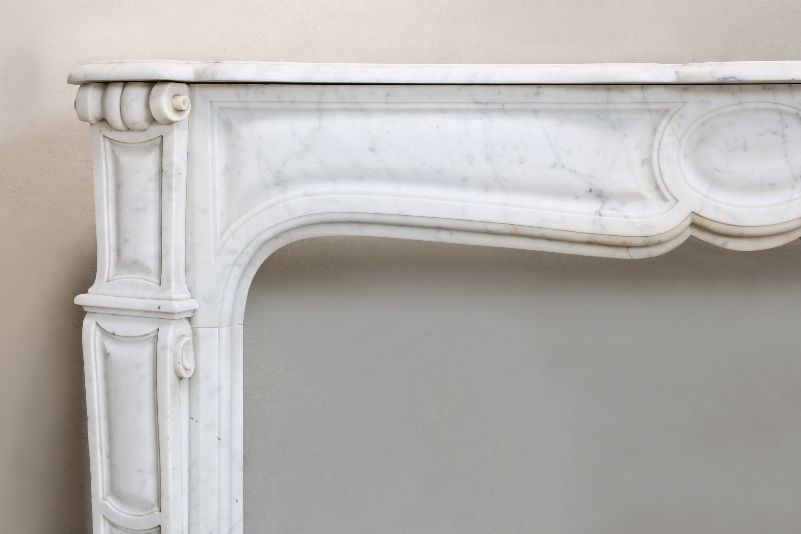Schöner kompakter und antiker Kamin aus Carrara-Marmor aus Italien. Dieser elegante Kamin stammt aus dem 19. Jahrhundert und verfügt über wunderschöne Ornamente und feine Linien an den Beinen. Charakteristisch für einen Pompadour-Kaminmaske ist das runde Ornament in der Mitte des Kamin.
