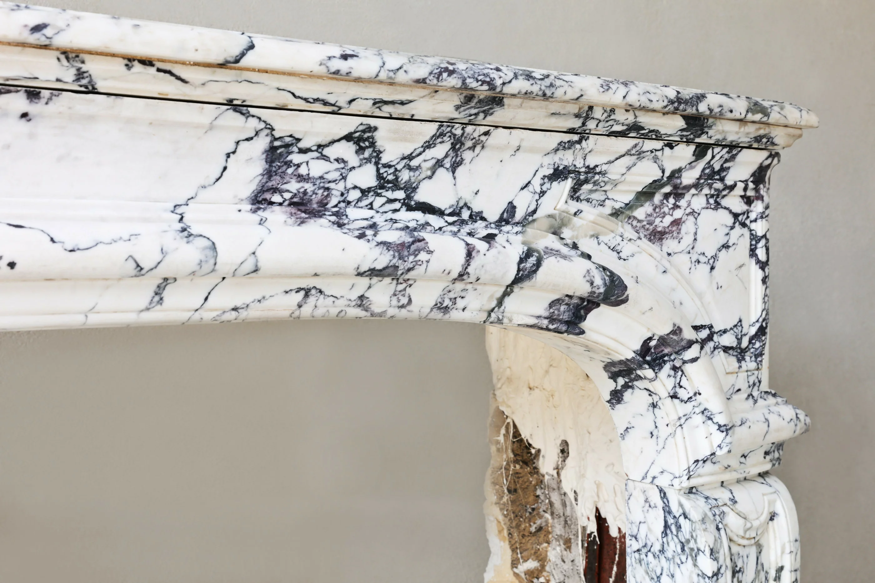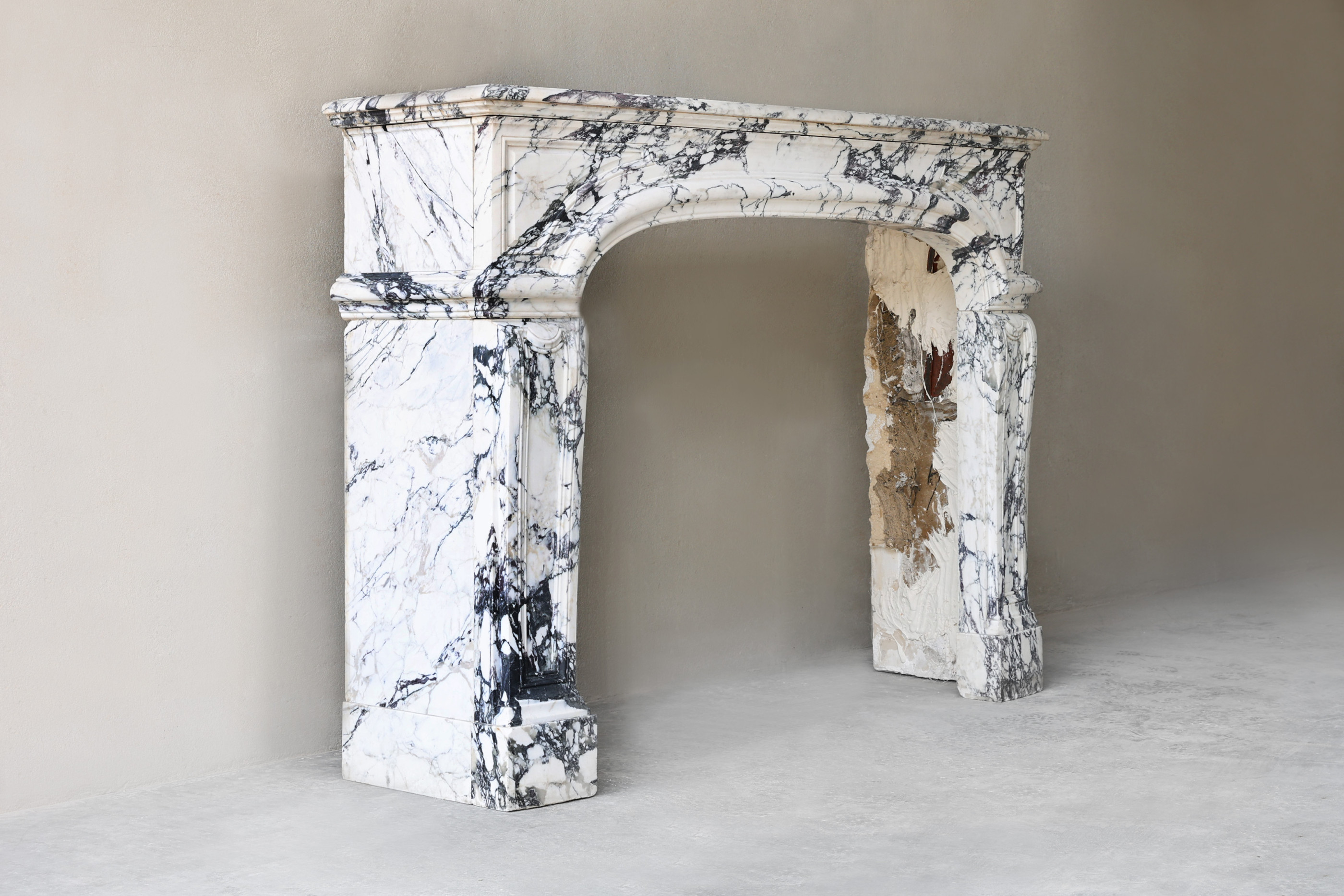 Diese antike Kaminumfassung aus dem 19. Jahrhundert im Louis-XIV-Stil besticht durch ihre historische Eleganz. Gefertigt aus erlesenem Paonazzo-Marmor – einem seltenen Naturstein mit cremeweißem Grund und eindrucksvollen Adern in Schwarz, Grau und Gold – verkörpert sie französische Wohnkultur in Perfektion:contentReference[oaicite:0]{index=0}. Dieses einzigartige Originalstück, das einst ein nobles Stadthaus im Pariser Viertel Le Marais schmückte:contentReference[oaicite:1]{index=1}, zieht als historischer Marmorkamin alle Blicke auf sich.