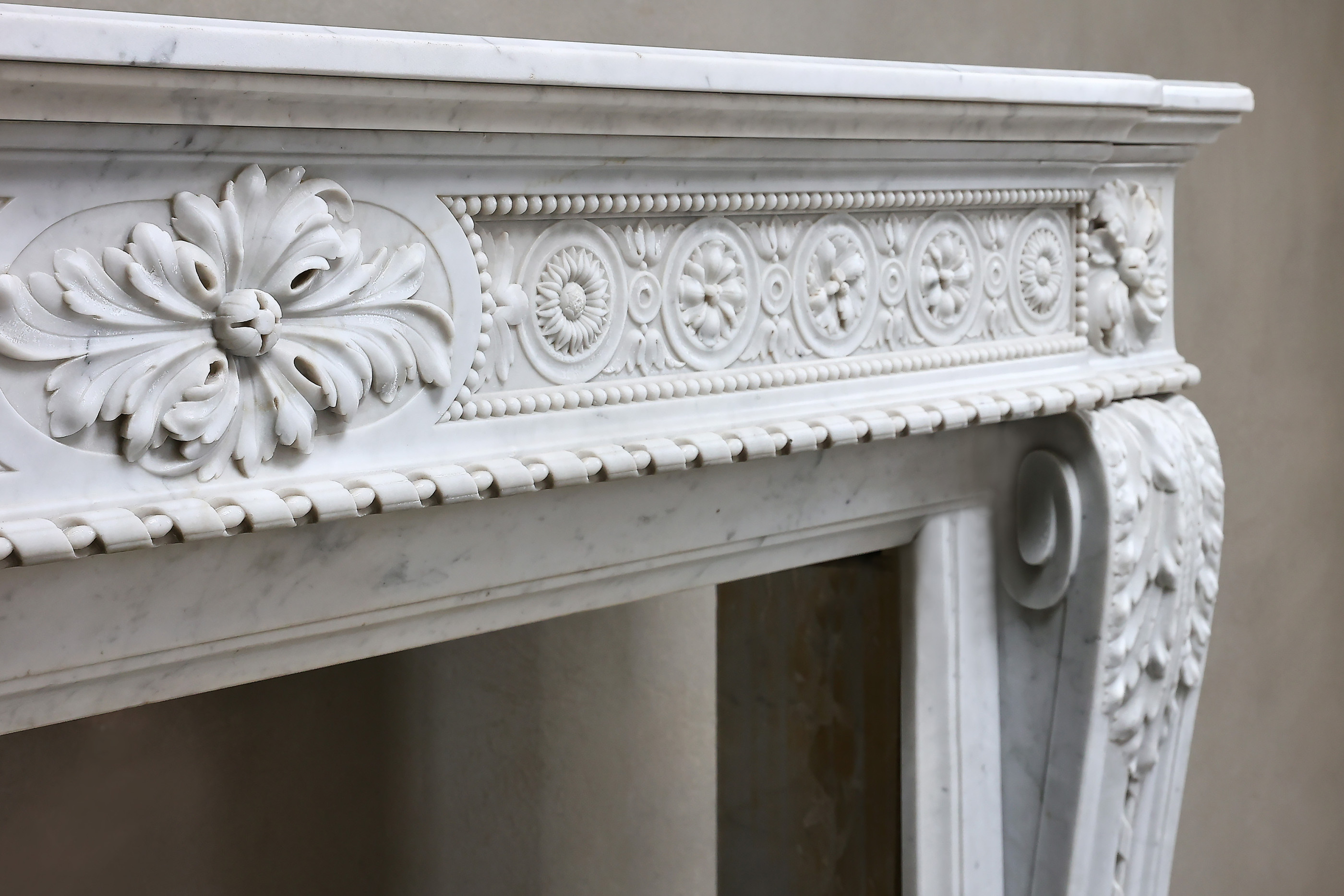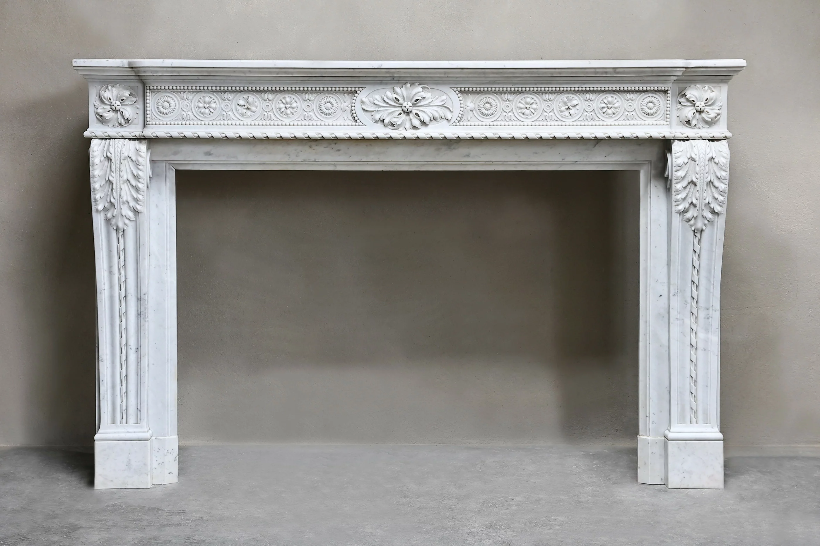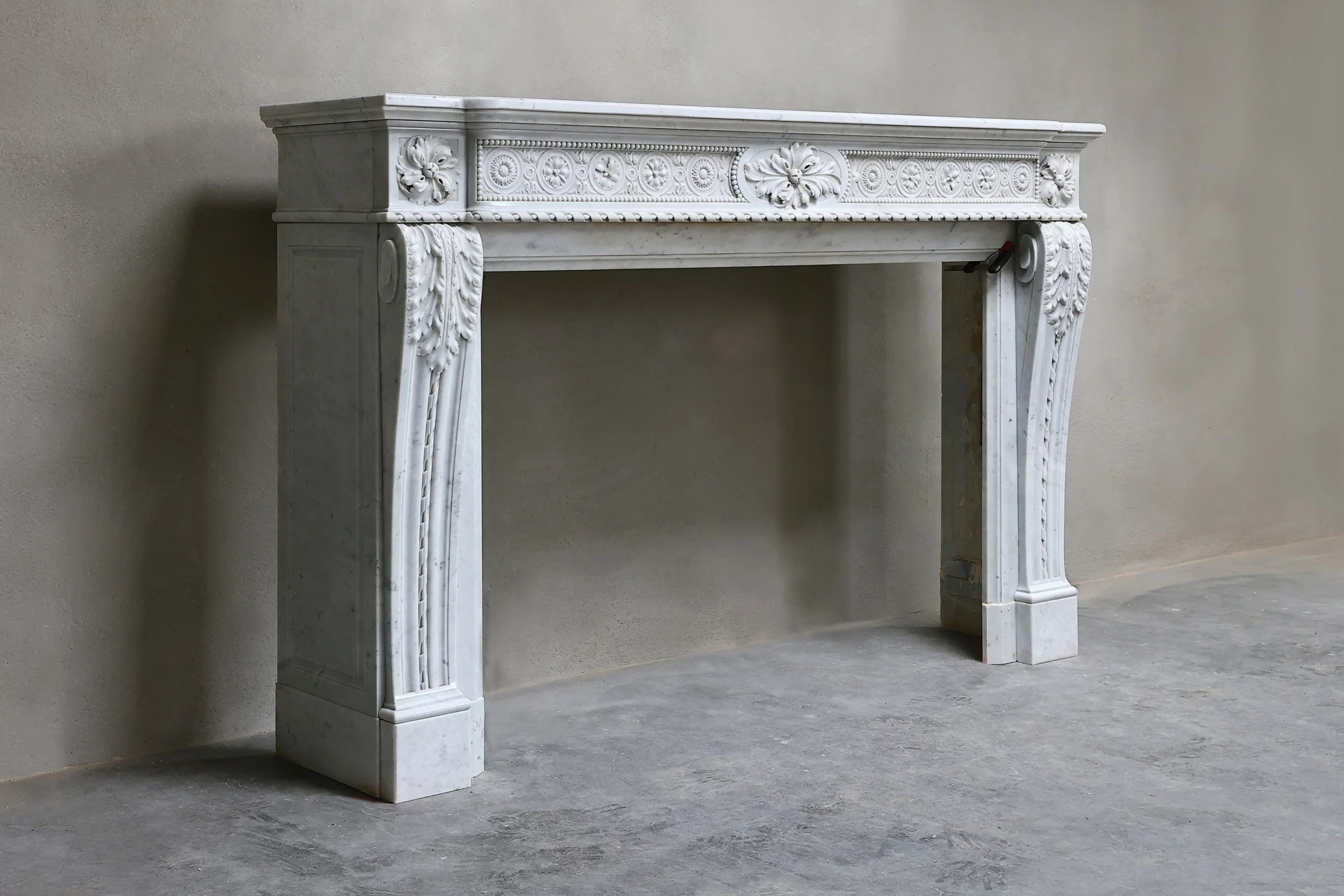 Sehr exklusiver Kaminmaske aus Carrara-Marmor aus Italien! Ein wunderschön dekorierter Kamin im Stil von Louis XVI mit verschiedenen Ornamenten im vorderen Teil des Kamins und an den Beinen! Dieser Kamin aus dem 19. Jahrhundert ist schick und sieht elegant aus!
