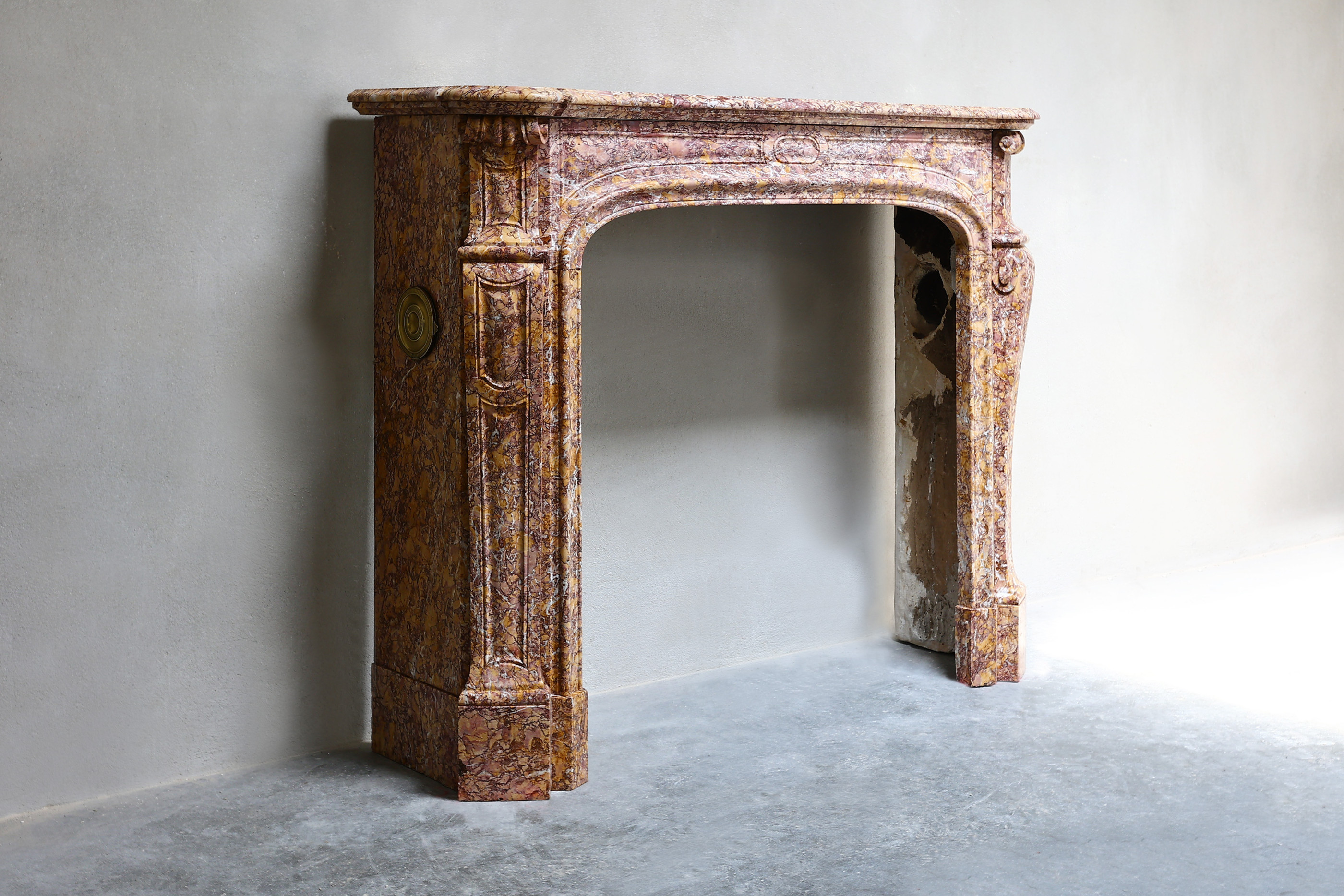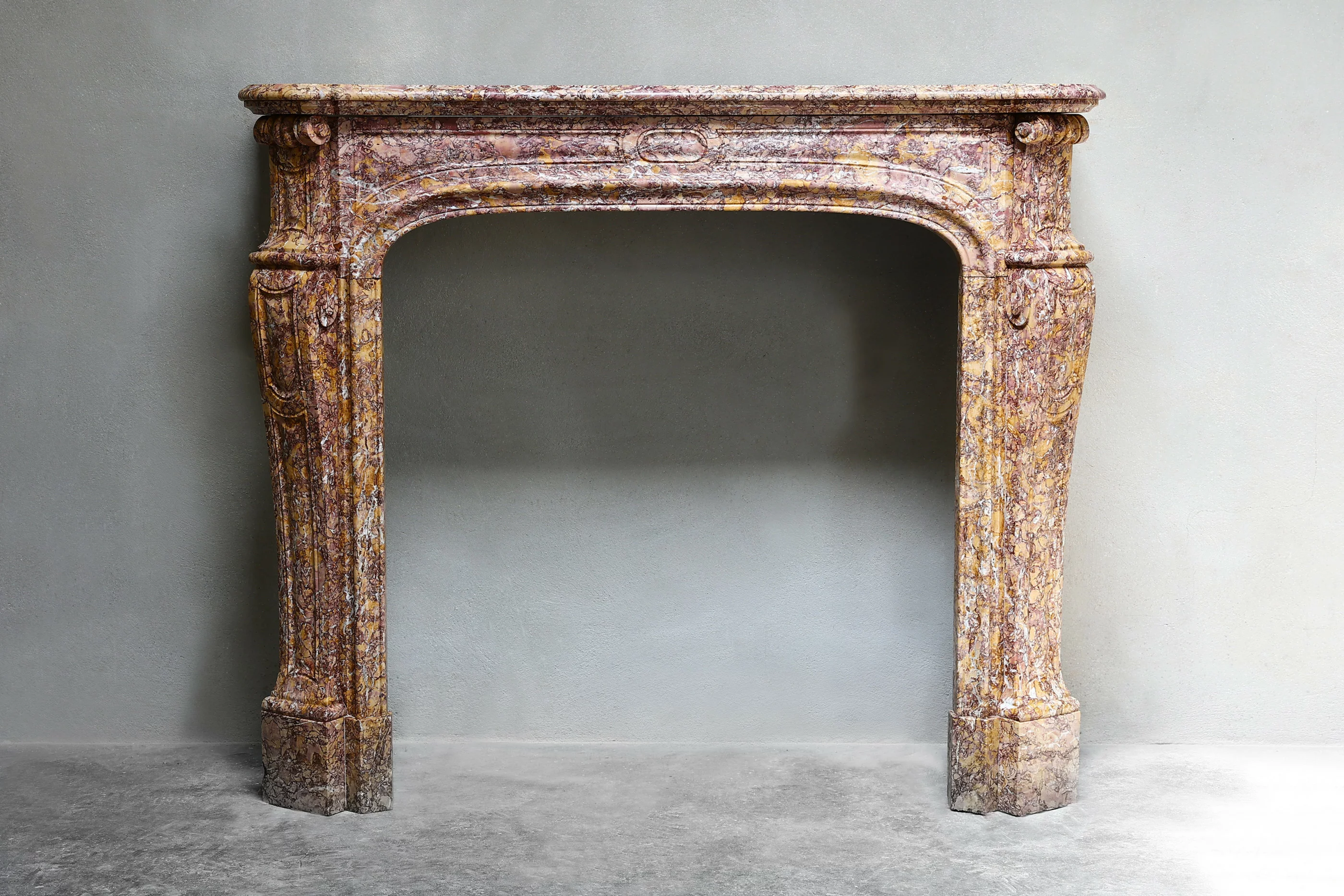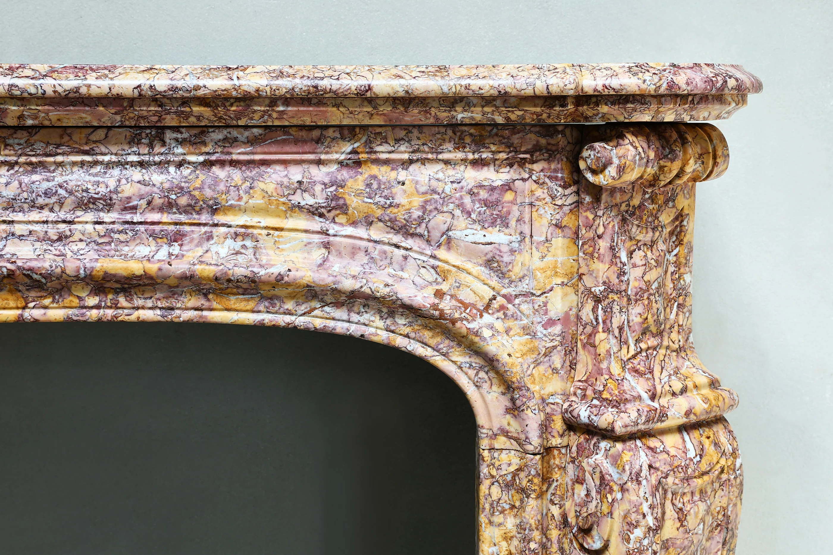 Entdecken Sie diesen eleganten Marmor-Mantel im Pompadour-Stil aus dem 19. Jahrhundert, gefertigt aus Brocatelle Violetta du Jura–Marmor aus Paris. Das raffinierte Design und die warmen Violetttöne machen ihn zu einem einzigartigen Highlight für anspruchsvolle Innenräume.