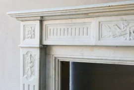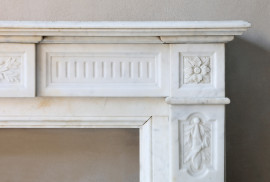 Sehr schöner antiker Kamin, der reich mit dekorativen Elementen verziert ist und dadurch ein elegantes Erscheinungsbild hat. Dieser Kaminsims aus Carrara-Marmor stammt aus dem 19. Jahrhundert und ist im Stil Ludwigs XVI. Ein gerader Kamin mit verschiedenen Ornamenten im Vorderteil und an den Beinen.
