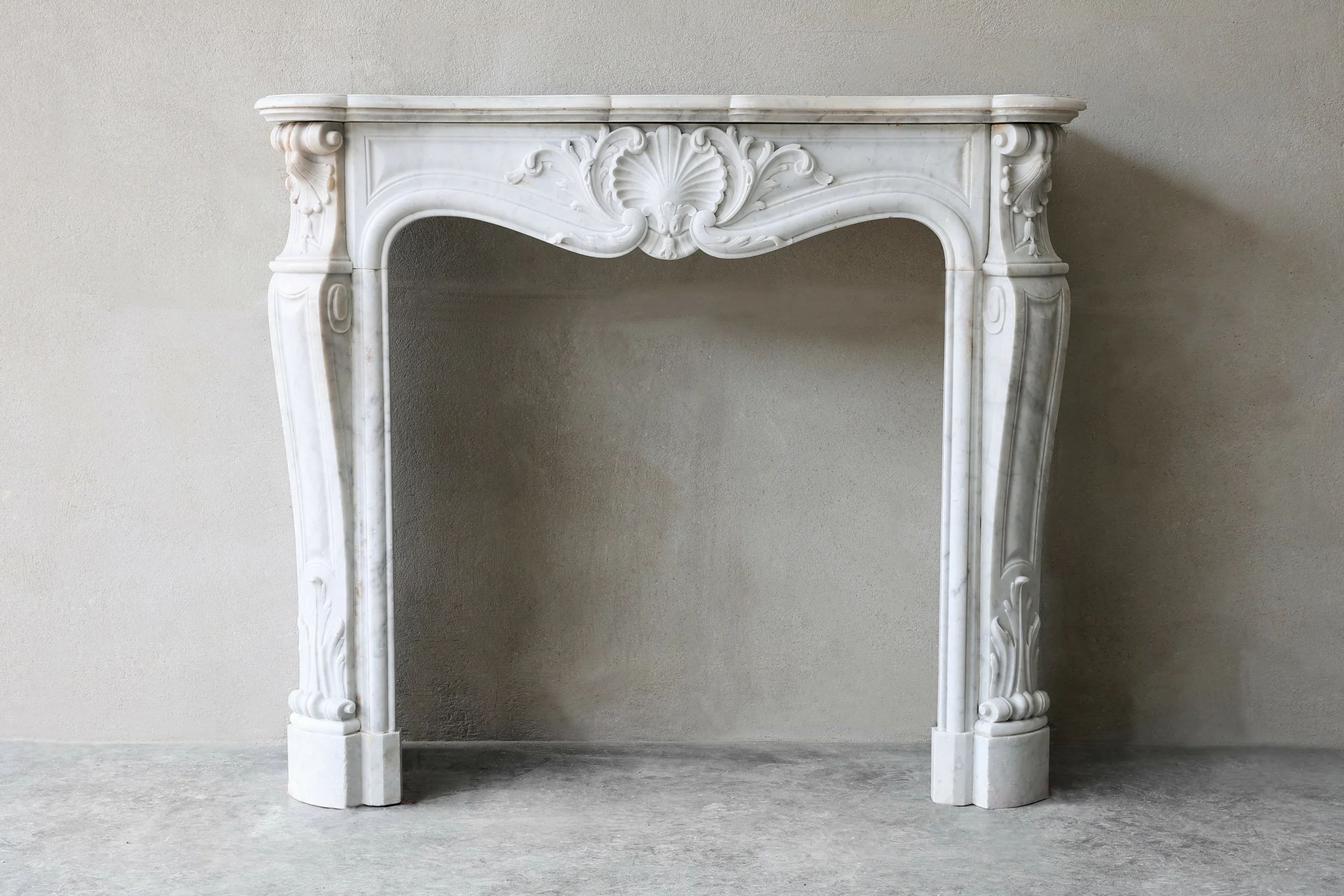 Schöner kompakter und antiker Kamin aus Carrara-Marmor aus Italien! Dieser Kamin ist im Stil von Louis XV und hat 'trois coquilles', eine große Muschel in der Mitte des Vorderteils und zwei Muscheln an den Beinen. Der Kamin stammt aus dem 19. Jahrhundert und hat ein elegantes und anmutiges Aussehen.