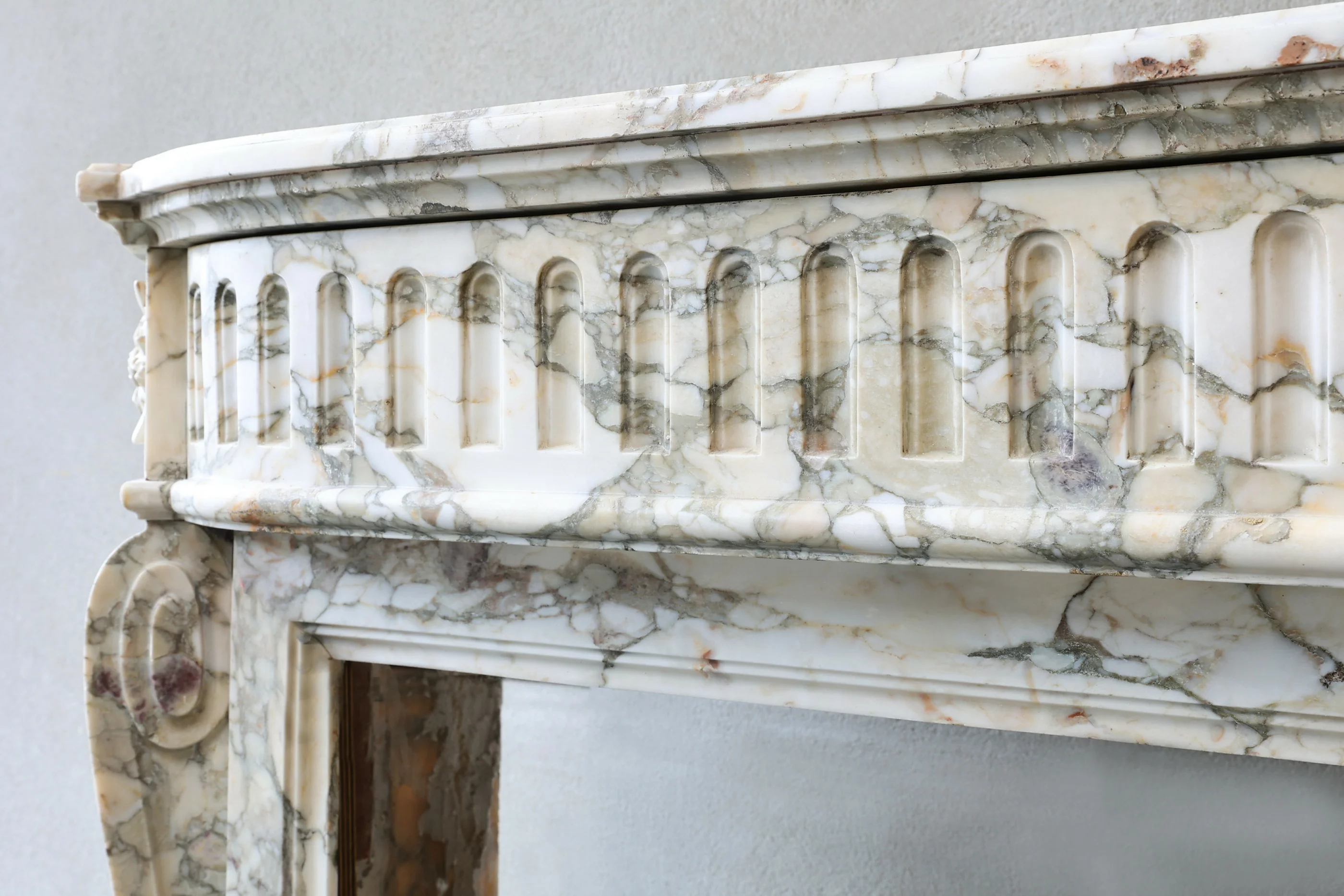 Wunderschöner antiker Kamin aus der besonderen Marmorsorte Calacatta Viola. Diese Marmorart hat eine neutrale Farbe mit einer warmen Farbnuance von violetten Tönen! Dieser Kamin ist im Stil von Louis XVI und stammt aus dem 19. Jahrhundert. Der Mantel ist mit Ornamenten, Flöten und schönen Linien verziert.