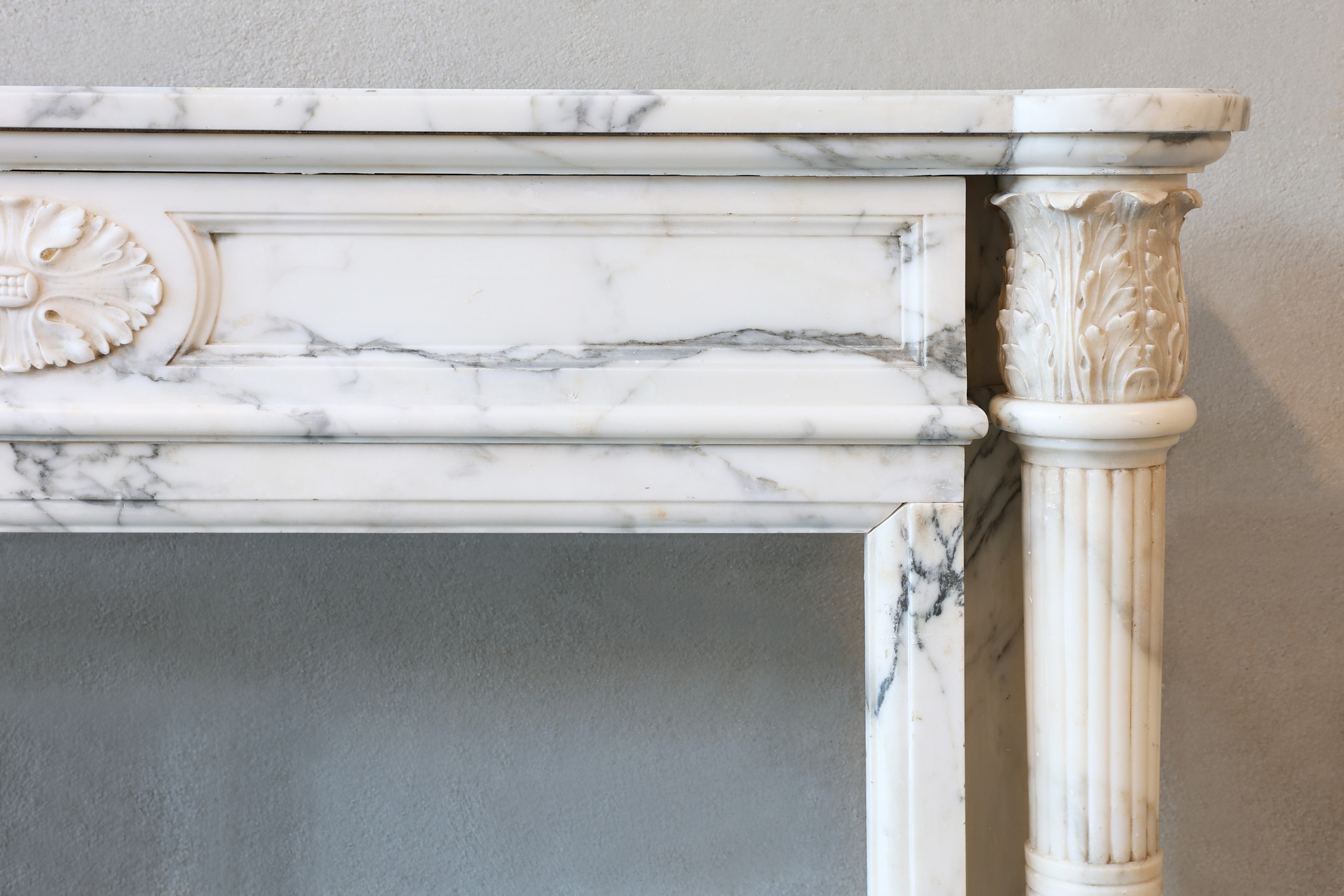 Wunderschöner antiker Kamin aus Arabescato-Marmor aus dem 19. Jahrhundert im Stil von Louis XVI. Dieser Kamin hat eine schöne Verzierung in der Mitte des Vorderteils und oben an den Beinen. Die Rillen an den Beinen verleihen diesem Kamin auch ein schönes Aussehen. Der weiße Arabescato-Marmor mit hellgrauen Adern verleiht dem Kamin einen besonderen Reiz! Ein besonderer Mantel in unserer Kollektion.