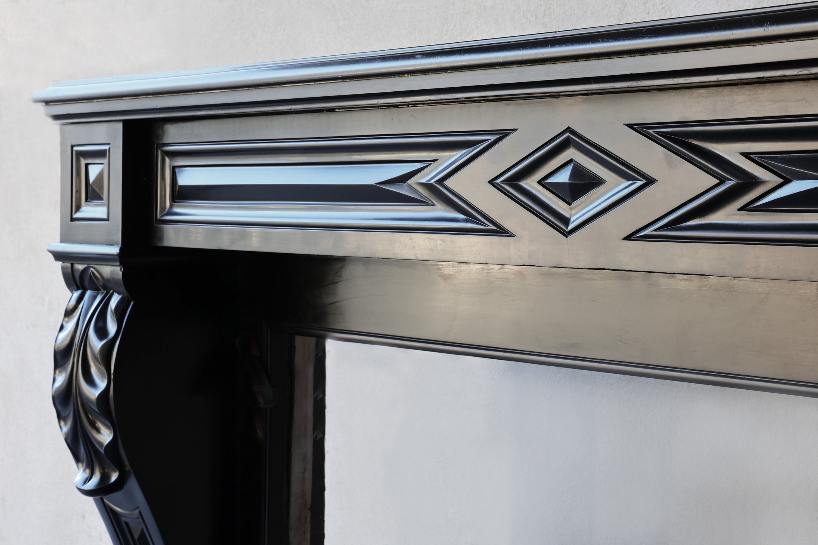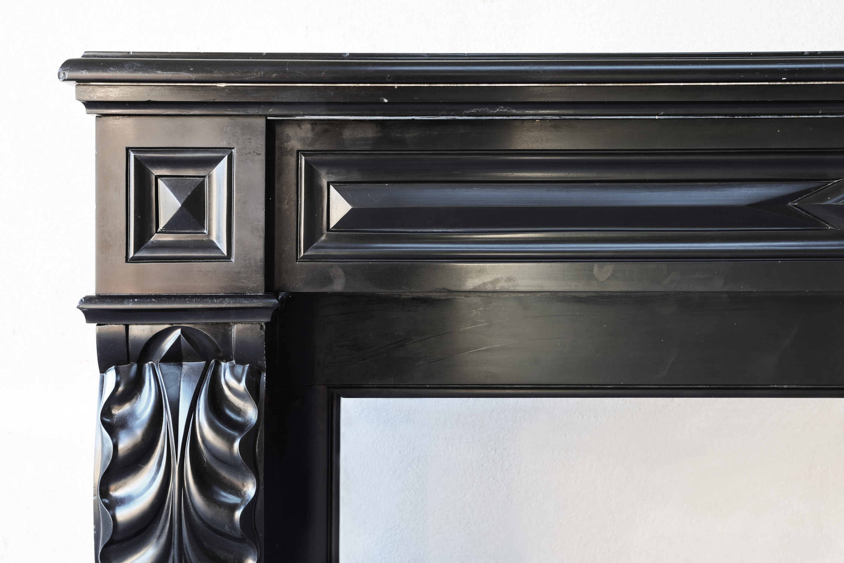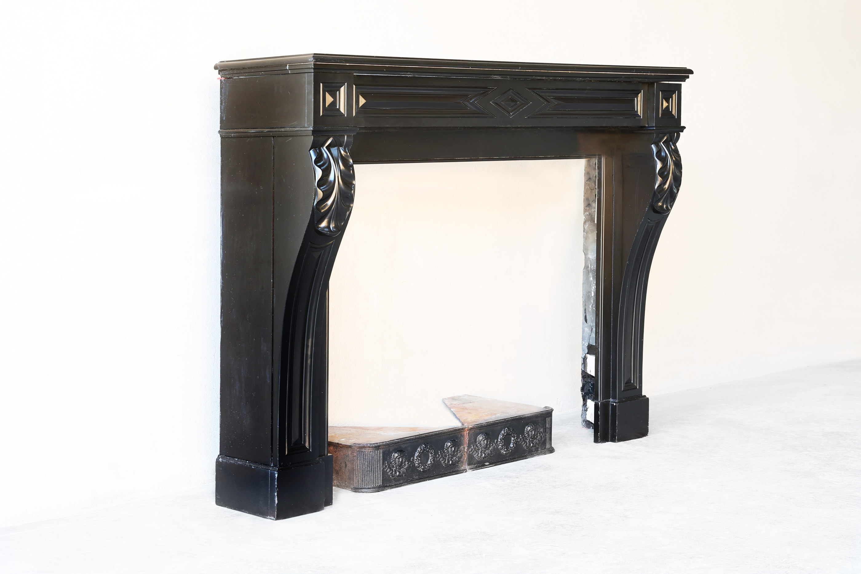 Wunderschöner Noir de Mazy Marmorkamin aus dem 19. Jahrhundert im Stil von Louis XVI. Dieser antiker Kamin hat eine gerade Oberseite und leicht gebogene Beine. Der Kamin hat schöne Ornamente und Dekorationen und passt in viele Innenräume.