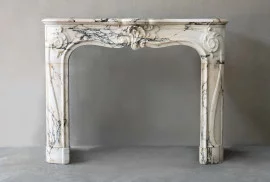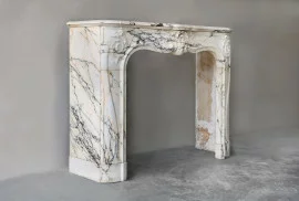 Dieser antike Marmorkamin stammt aus dem späten 19. Jahrhundert und wurde in Paris gefertigt. Das Design folgt dem eleganten Louis-XV-Stil, der für seine geschwungenen Linien und harmonischen Proportionen bekannt ist. Der Kamin besteht aus edlem Paonazzo-Marmor – einem Naturstein mit hellem Grundton und markanter Maserung in Schwarz, Gold und Grau.