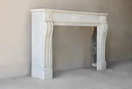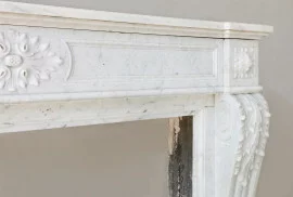 Gefertigt aus edlem Carrara-Marmor, geschätzt für seine Homogenität und zeitlose Ausstrahlung. Die Front wird von kannelierten Lisenen mit Blattkapitellen getragen; das Fries zeigt ein zentrales Blumenmedaillon – typisch für den Louis XVI-Stil.