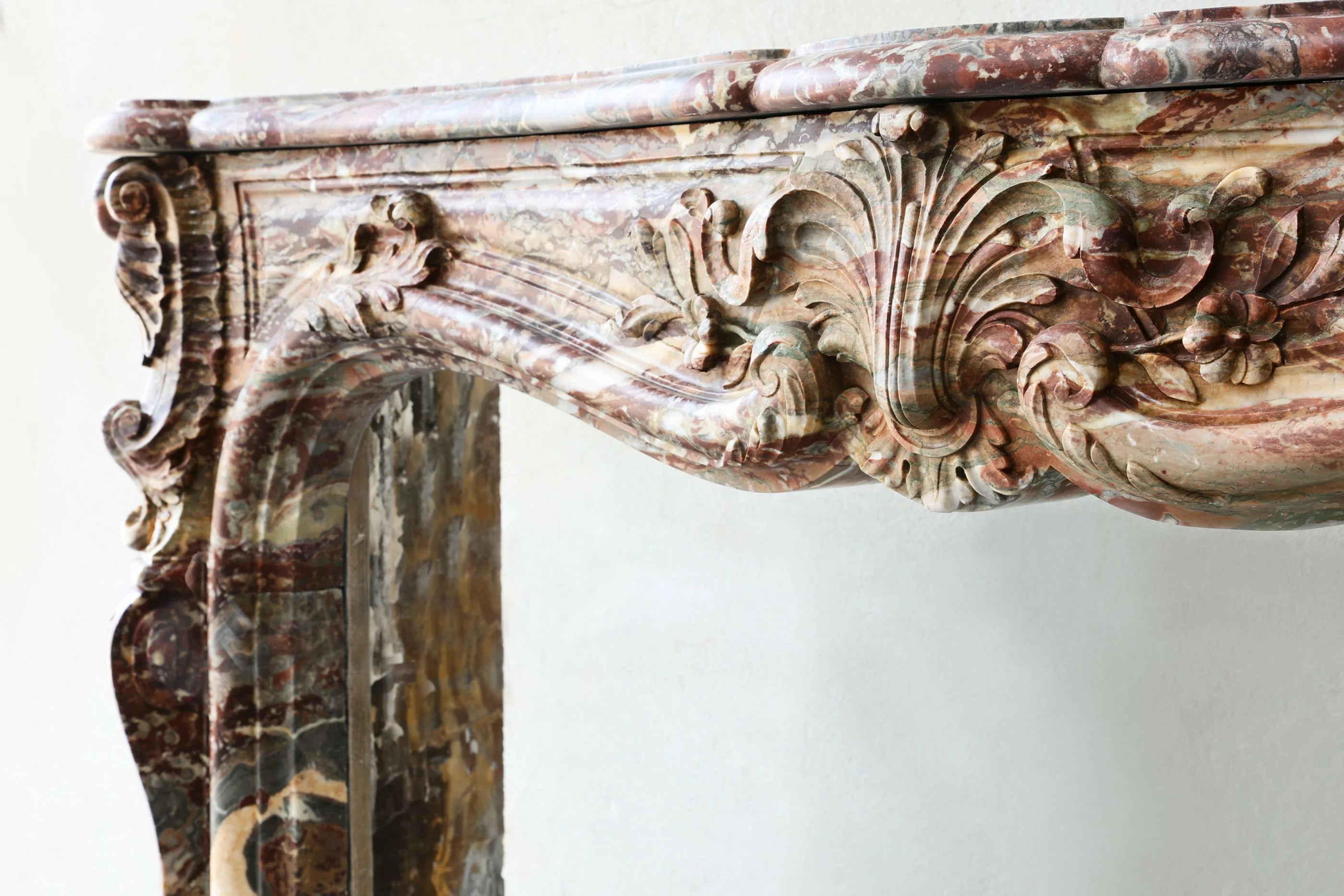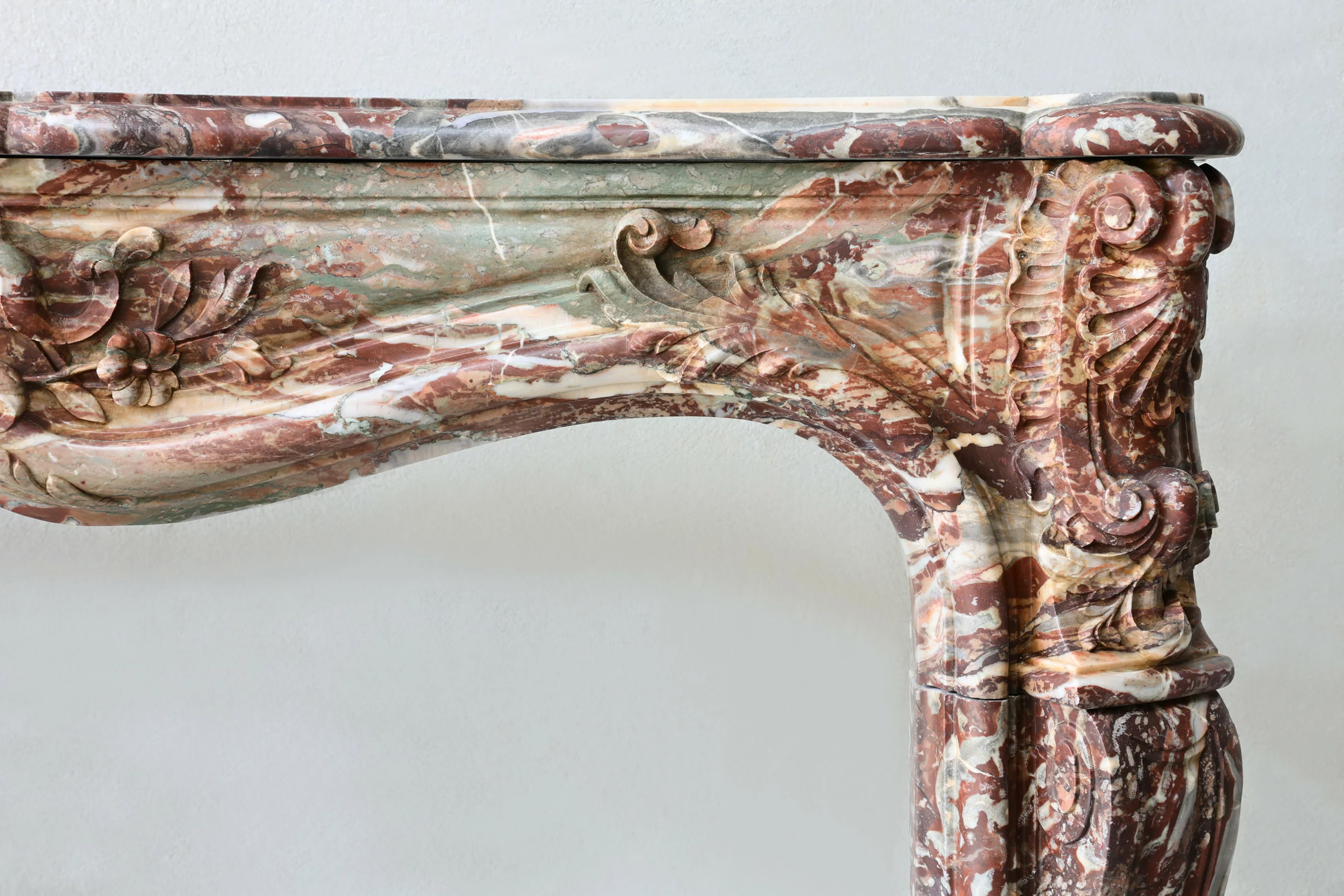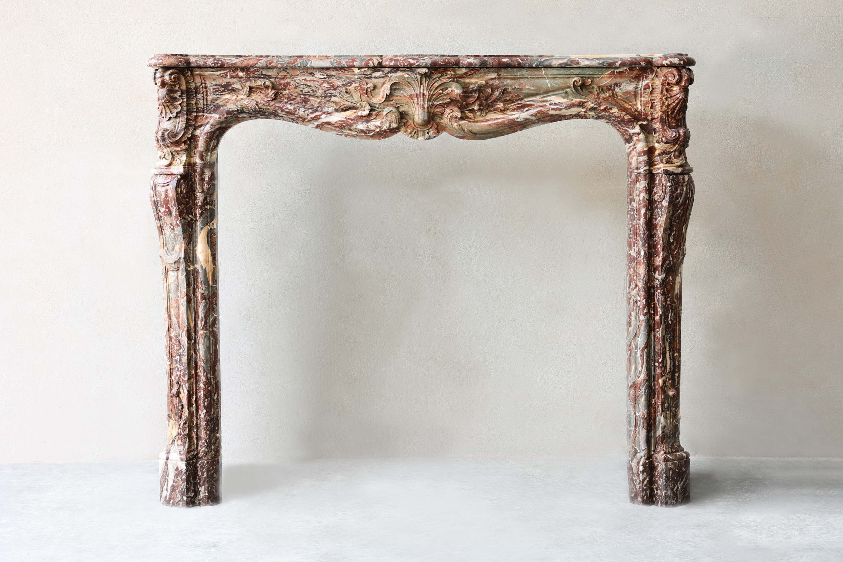 Dieser authentische antike Marmorkamin wurde im 19. Jahrhundert in Rouge Royal Belge gefertigt – ein seltener belgischer Rotmarmor mit feiner weiß-, grau- und grünlich-schimmernder Aderung. Die Louis-XV-Formgebung zeigt weiche Schwünge, feine Profilierungen und ausgewogene Proportionen.