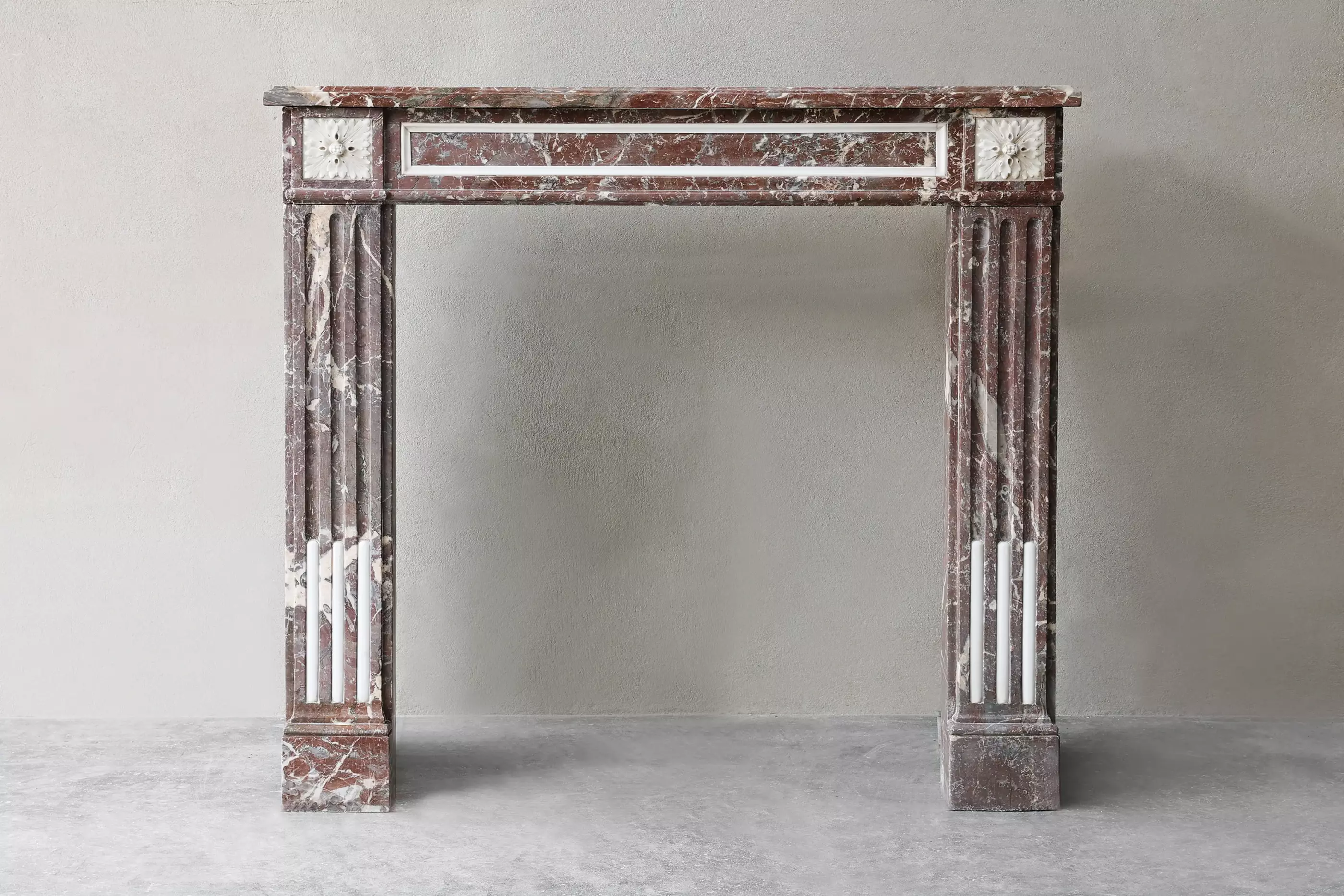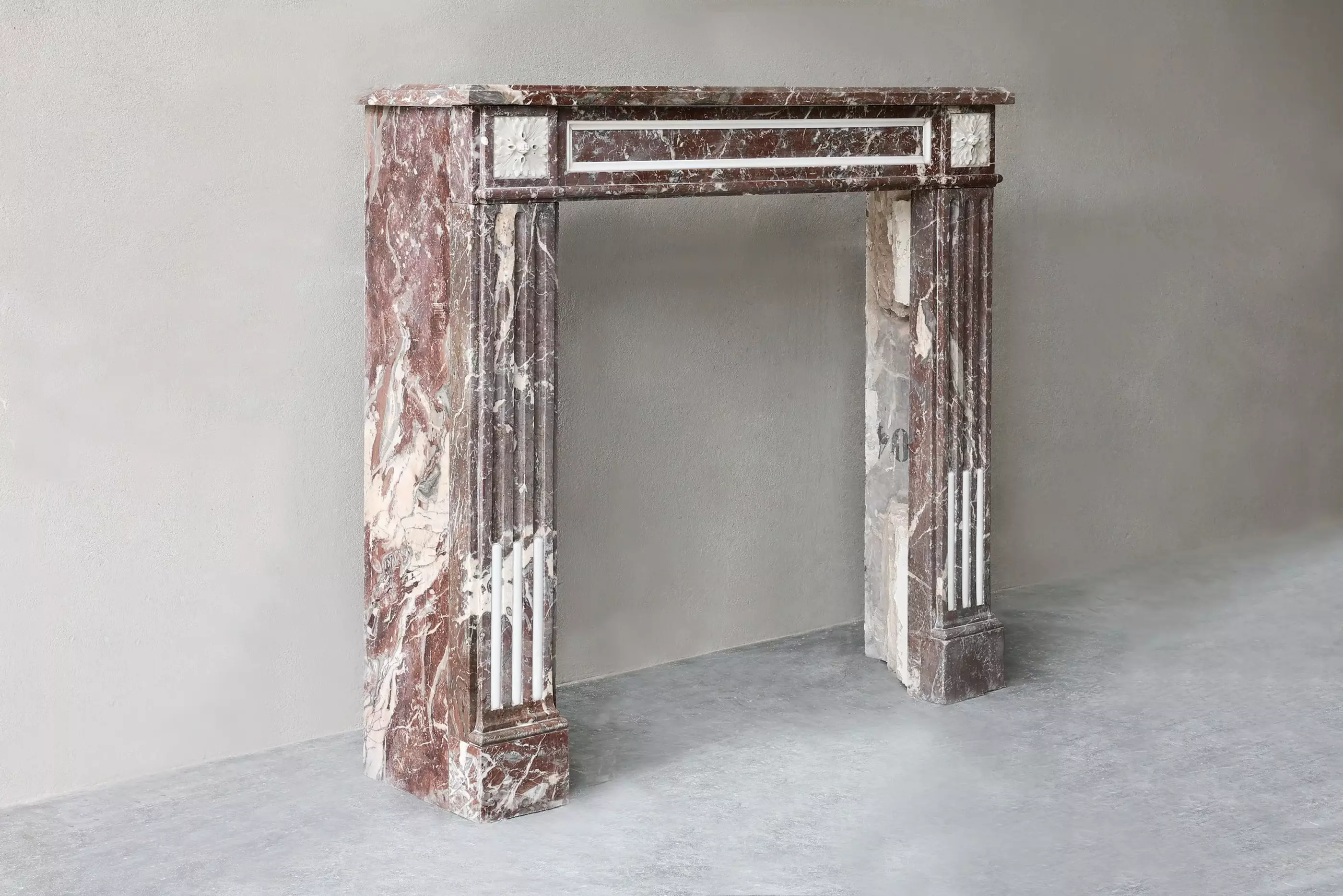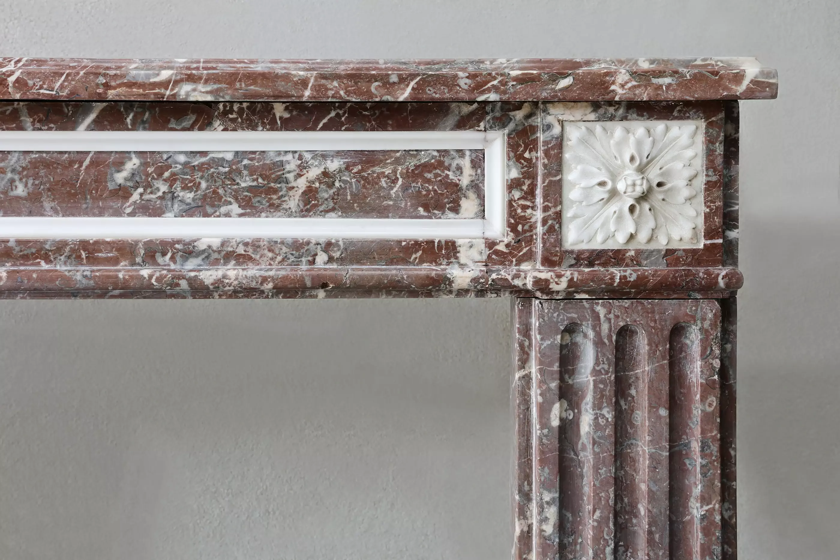 Rouge Royal des 19. Jahrhunderts – eine seltene antike Kaminmantel-Ausführung aus tiefrotem belgischem Marmor mit weißer Aderung im Louis-XVI-Stil. Straffe Proportionen treffen auf fein gearbeitete Rosetten, Kanneluren und dezente Weißmarmor-Einlagen.
