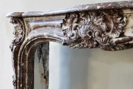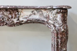 Diese antike Kaminumrandung ist aus massivem, natürlich geadertem Marmor gefertigt und weist eine rot- und cremefarbene Zeichnung auf. Der Kamin besteht aus einem profilierten Sims, einer weich geschwungenen Öffnung und geschnitzten Seitenteilen. Das Objekt ist vollständig aus Stein gearbeitet und als dauerhaftes architektonisches Element konzipiert.