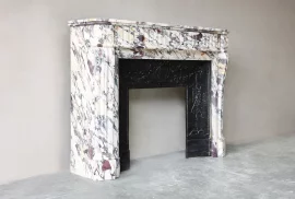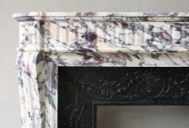 Dieser Kamin im Louis-XVI-Stil aus dem 19. Jahrhundert aus Brèche-Violetta-Marmor ist ein klar gestaltetes und repräsentatives Stück, geprägt von hochwertigen Materialien und klassischer Detailarbeit. Der Marmor zeigt markante violette, graue und cremefarbene Aderungen, die ihm ein kraftvolles und unverwechselbares Erscheinungsbild verleihen. Das gusseiserne Innenstück ist original und mit für den Louis-XVI-Stil typischen Reliefs verziert.