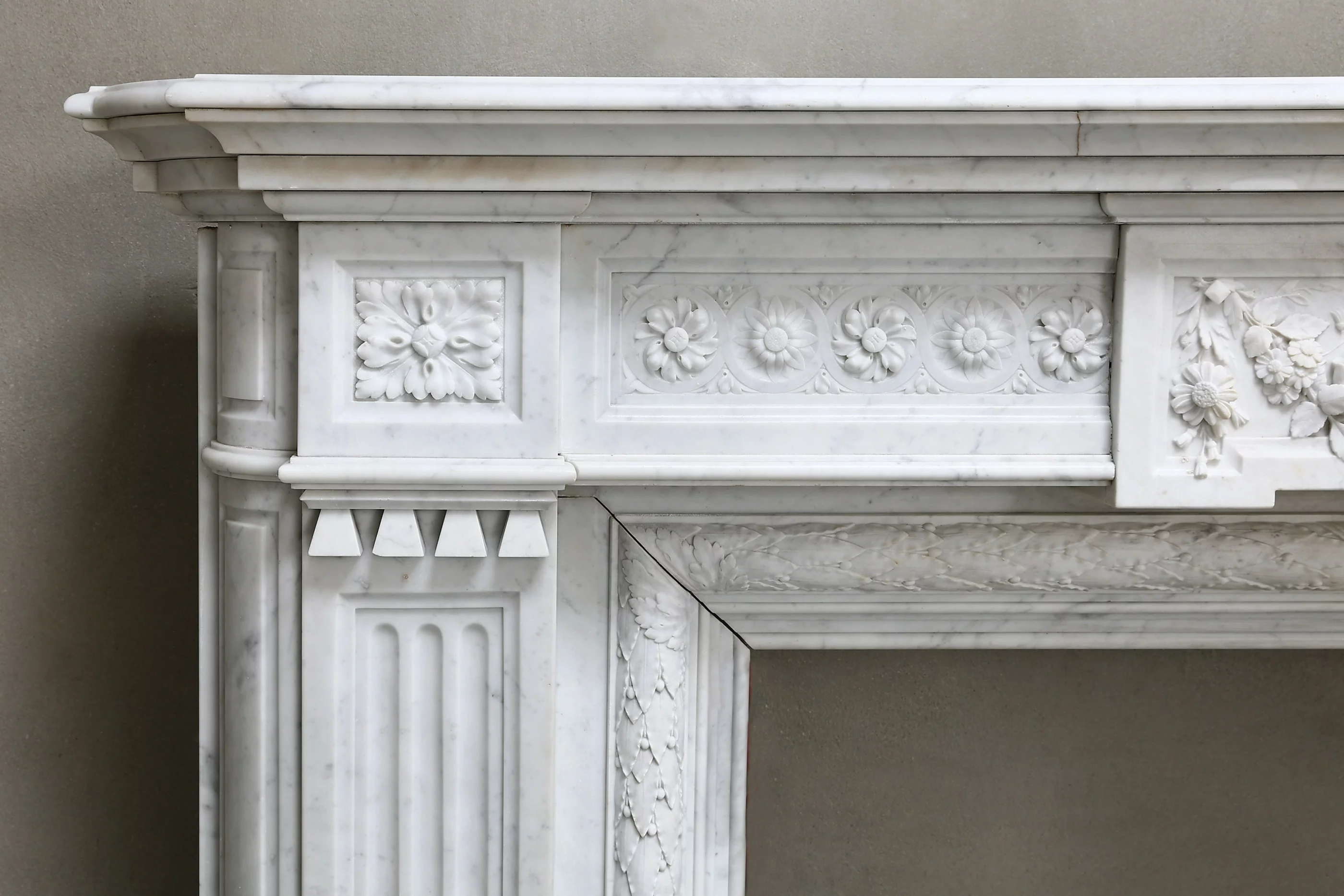 Ein sehr schick dekorierter Kamin aus Carrara-Marmor aus Italien. Dieser antiker Kamin stammt aus den Jahren 1860 - 1880 und ist im Stil von Louis XVI, reich verziert mit Ornamenten und Kannelierungen an den Beinen. Ein Kamin, der auch in der Größe vorhanden ist, die Breite beträgt nicht weniger als 182 cm, was für Marmorkamine etwas Besonderes ist!