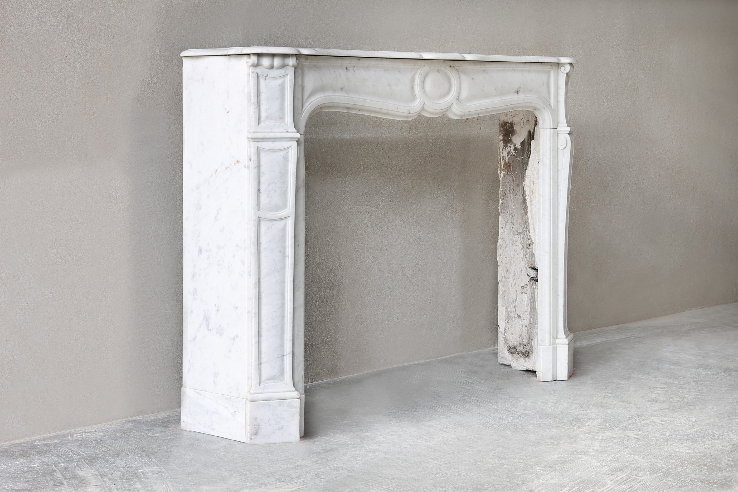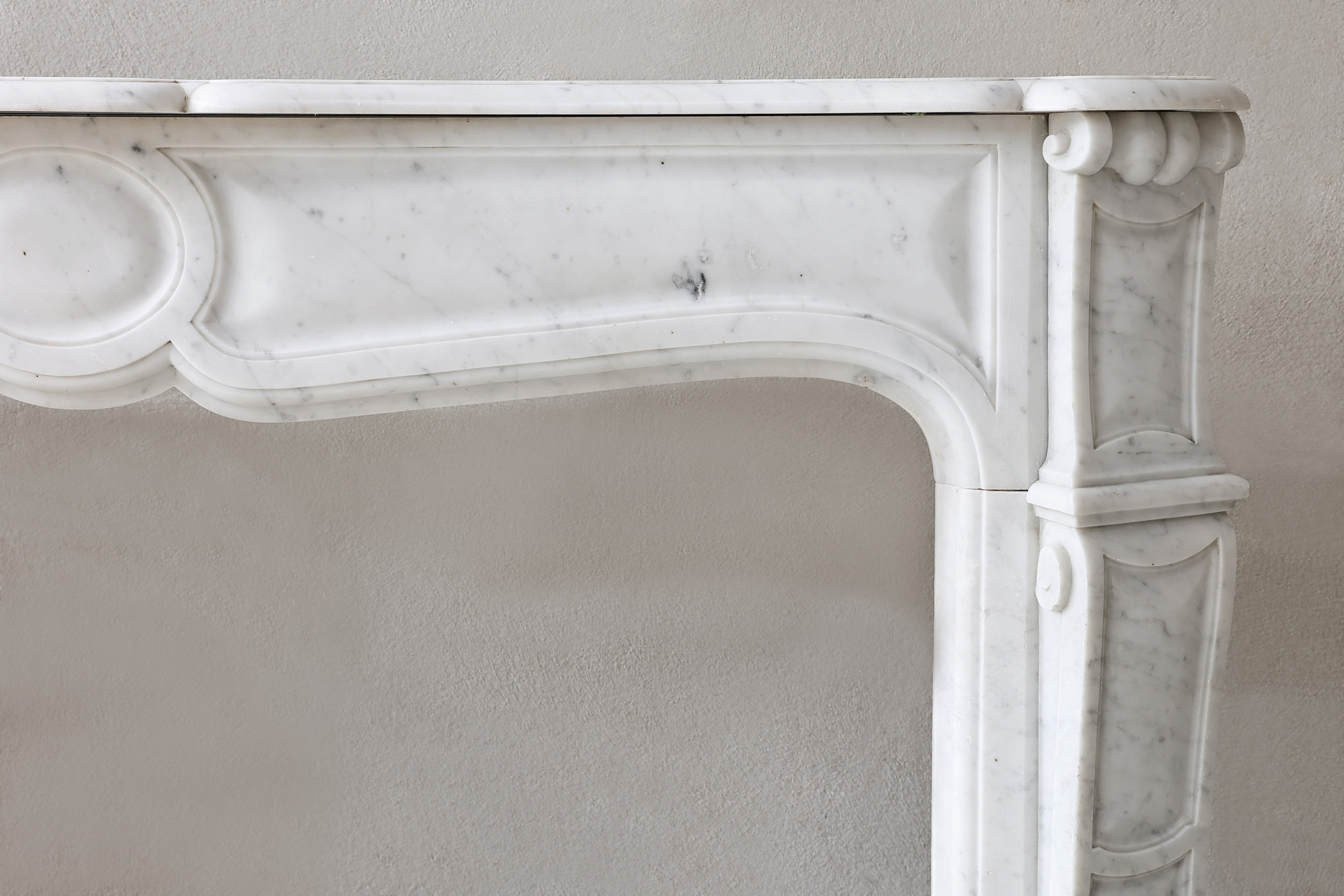 Ein einzigartiges Set aus zwei identischen Kaminen aus Carrara-Marmor! Diese beiden Kaminsimse sind im Pompadour-Stil gehalten und zeichnen sich durch das runde Ornament in der Mitte des Vorderteils aus. Eine sehr seltene Kombination aus dem 19. Jahrhundert, die perfekt in Ihr Interieur passen würde!
