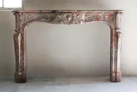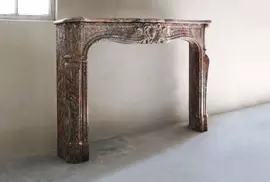 Sehr seltener antiker Kamin aus dem 18. Jahrhundert, der Zeit von Ludwigs XV. Ausgestattet mit einer Jakobsmuschel in der Mitte und einem schönen Rahmen (Moulure), der auf den Beinen läuft. Der Kamin ist gemacht von das Marmortyp Rouge Belge.