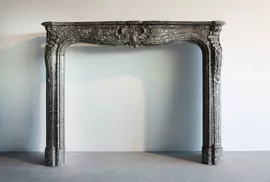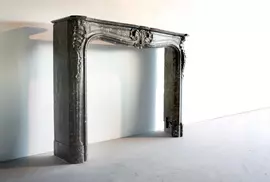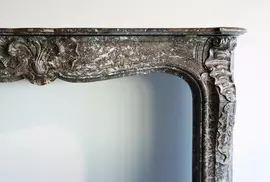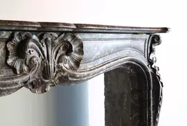 Sehr schöner antiker Marmor Kamin der Marmorart Gris de Ardennes. Der Kamin hat eine schöne Moulure (Bilderrahmen) und hat eine schöne Coquille in der Mitte. Die Seiten der Beine sind auch wunderschön dekoriert. Die Form der Kamin macht diesen Kamin zu einem Bestand in jedem Wohnzimmer.